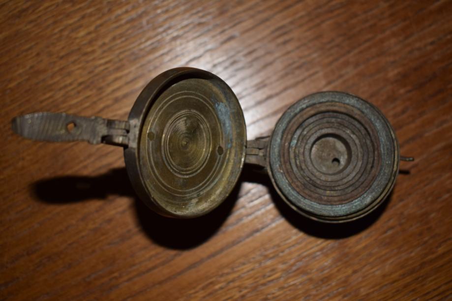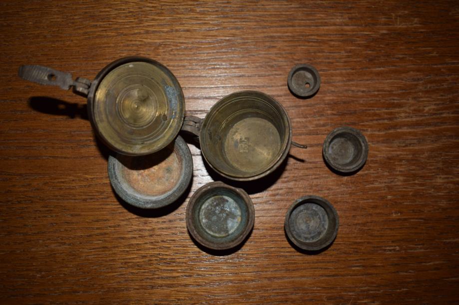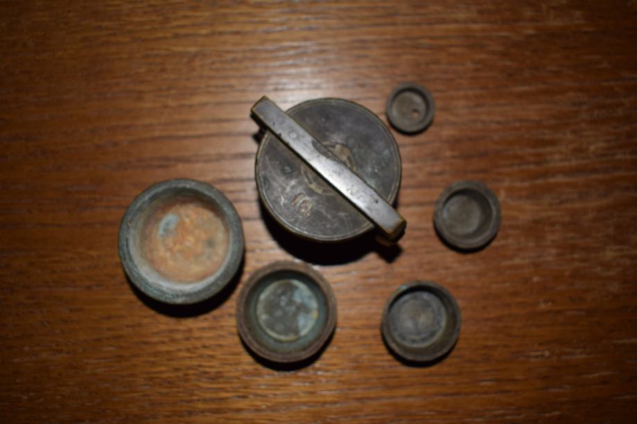 Utezi putujućeg trgovca. Izrađeni od mesinga. Uklapaju se jedan u drugi. Najvjerojatnije 19. st.