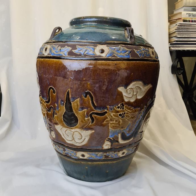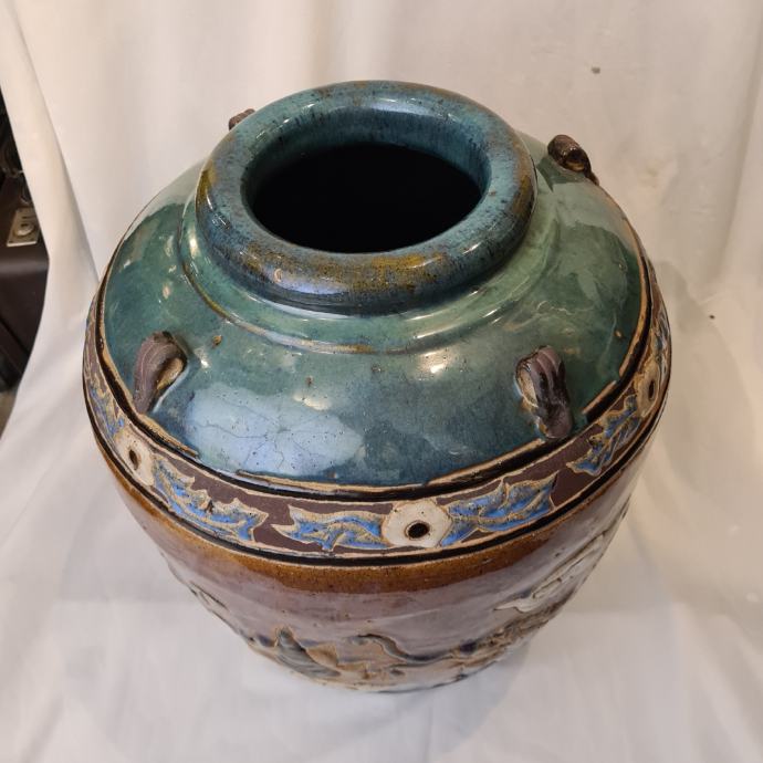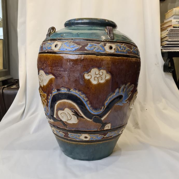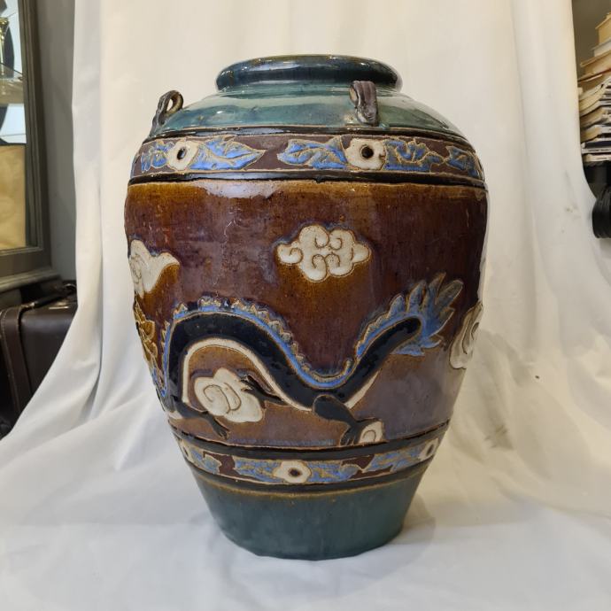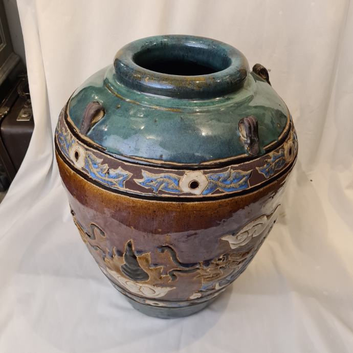 Veliki keramička posuda/vaza od terakote izrađen u prvoj polovici 20. stoljeća u Europi. Ručno oslikana motivom zmajeva.