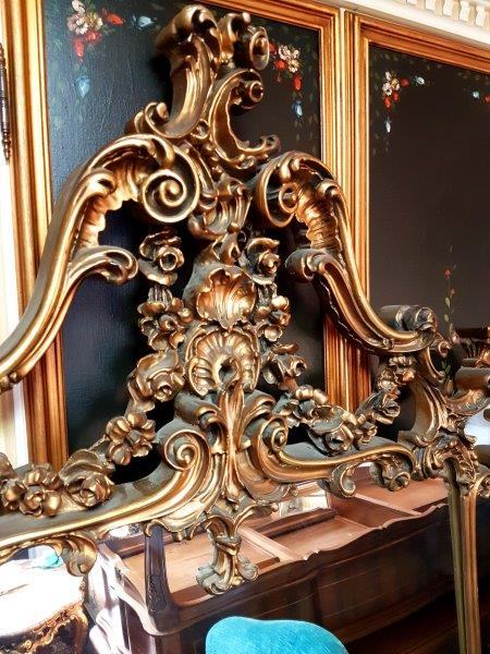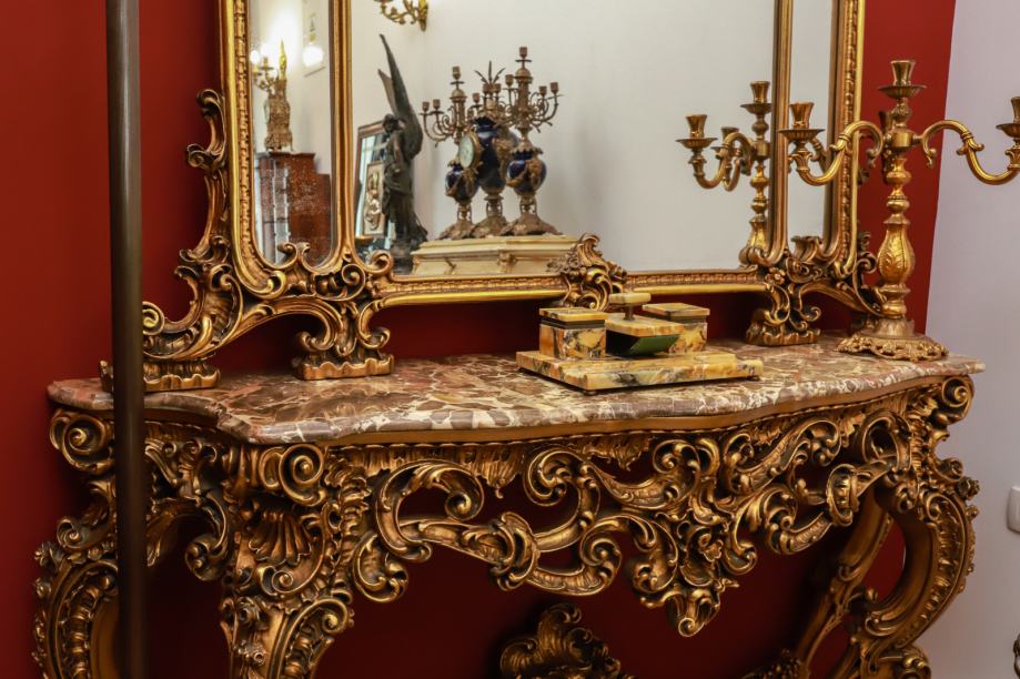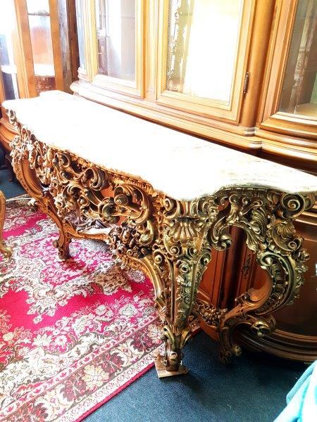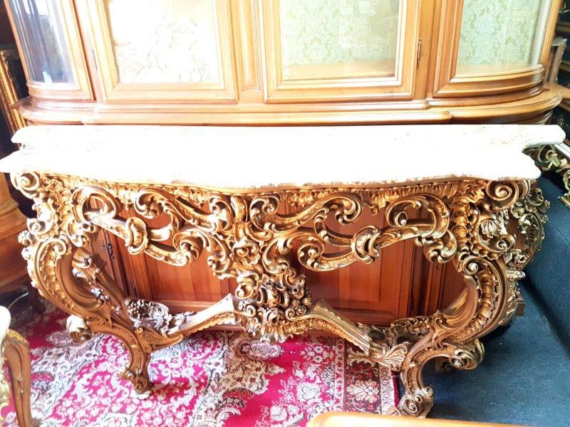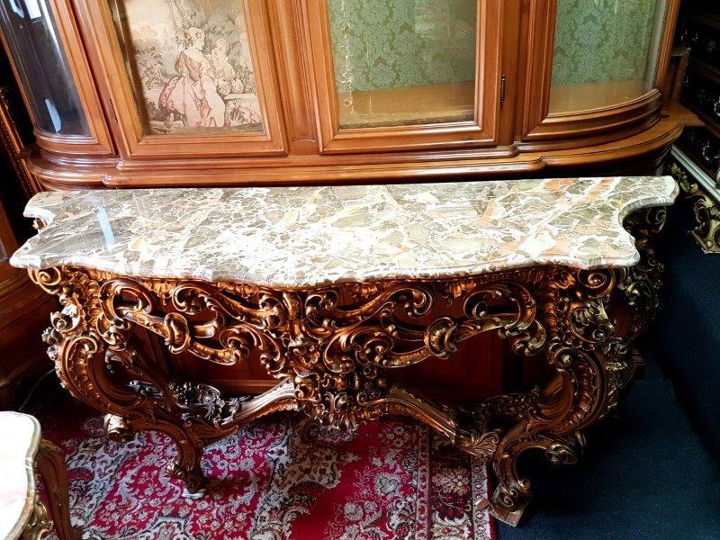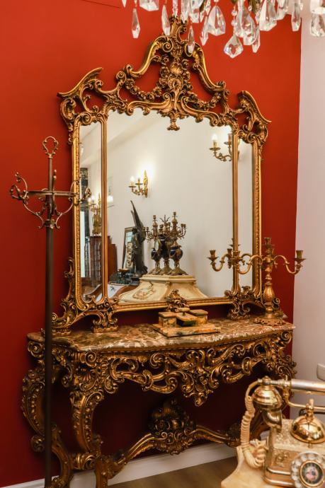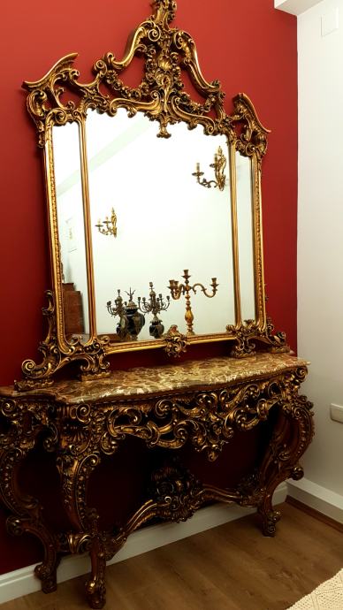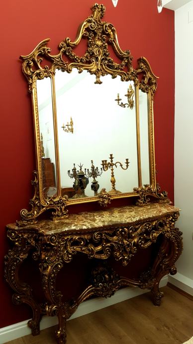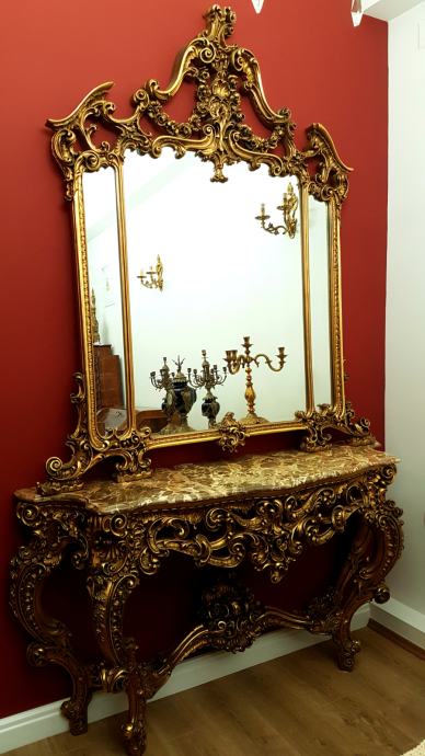 Veličanstvena drvena konzola s mramornom pločom i ogledalom, rad u drvetu, bojana tehnikom zlatnih listića, impresivan komad, impresivnih dimenzija. Stanje perfektno.