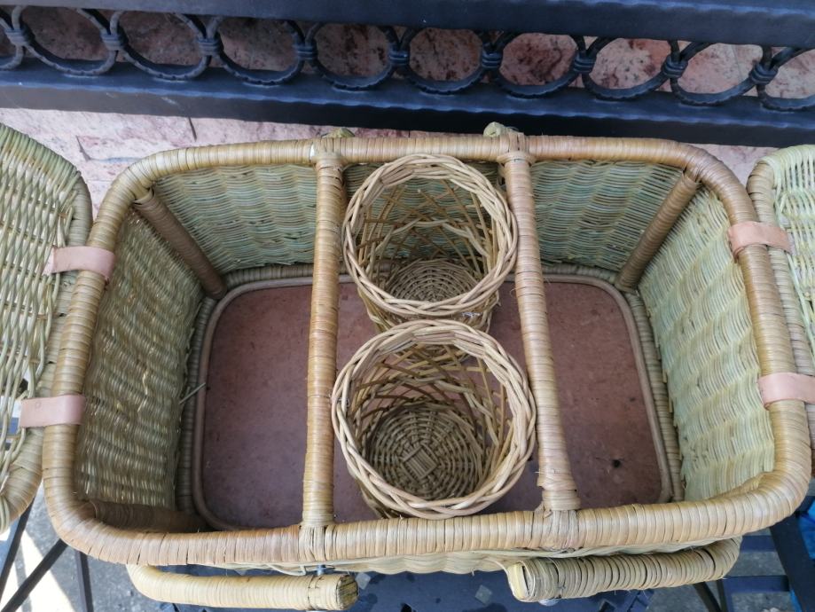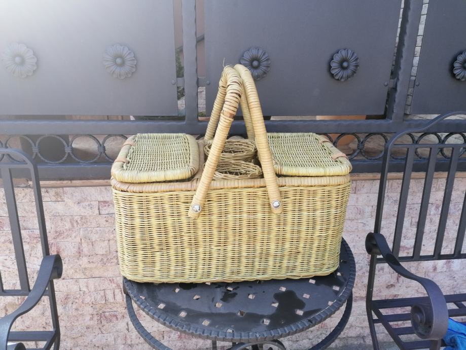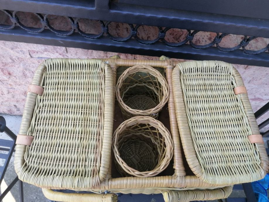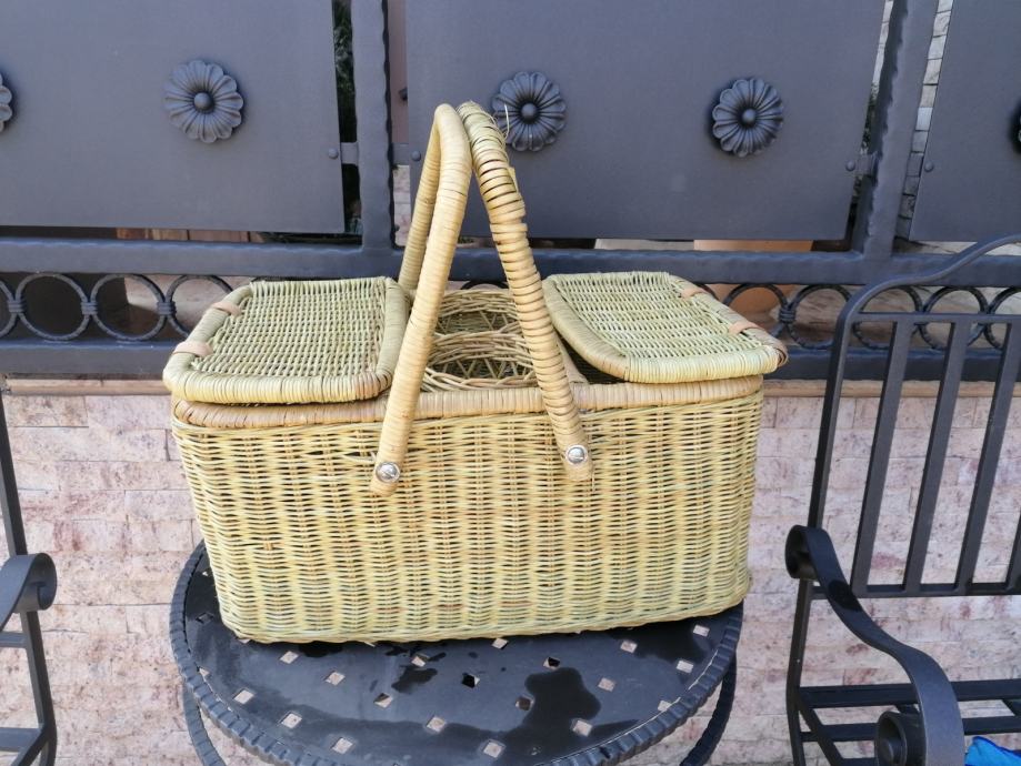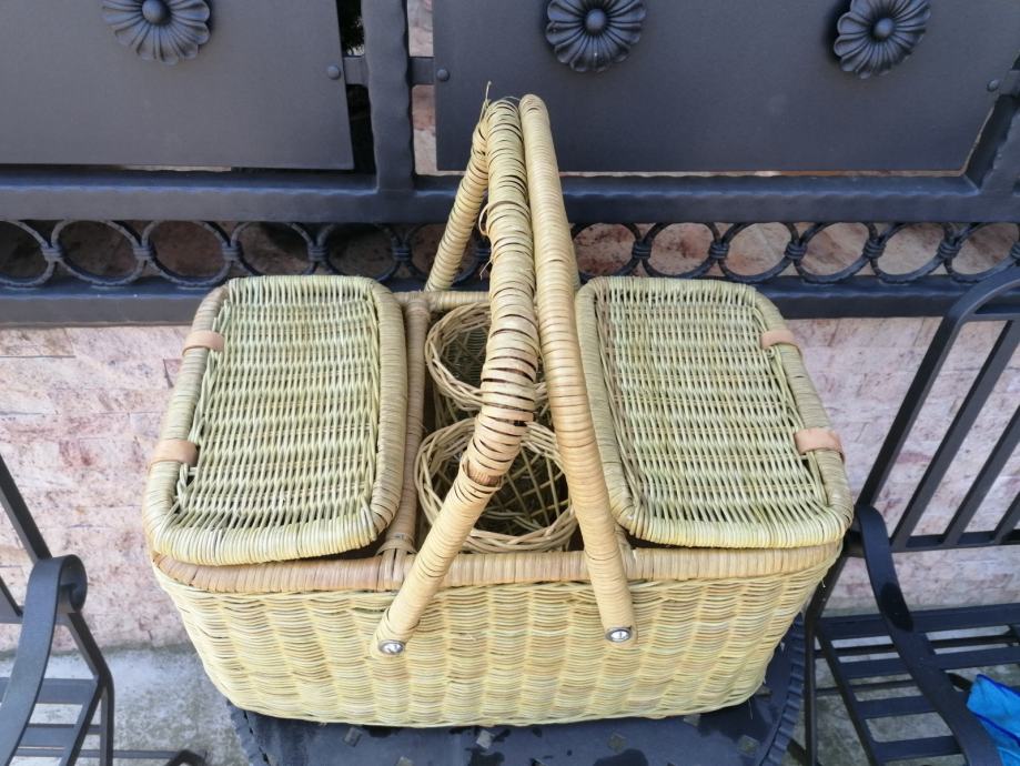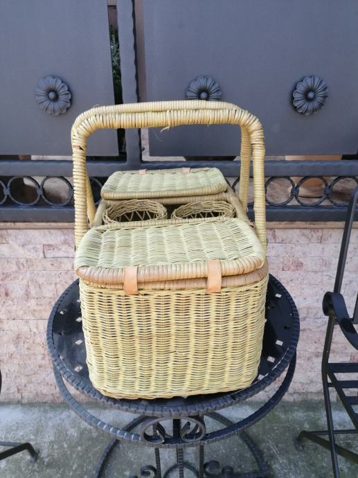 Predivna velika košara za piknik u odličnom stanju. Ima poseban dio za dvije boce. Sa jednu ručku treba ponovo obložiti. Dimenzije 56x30x25 cm. Dobijate predmet sa slika.