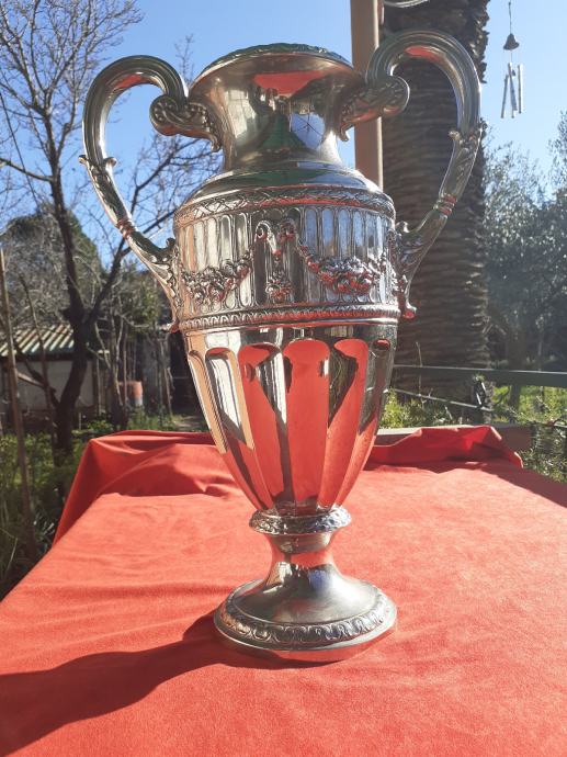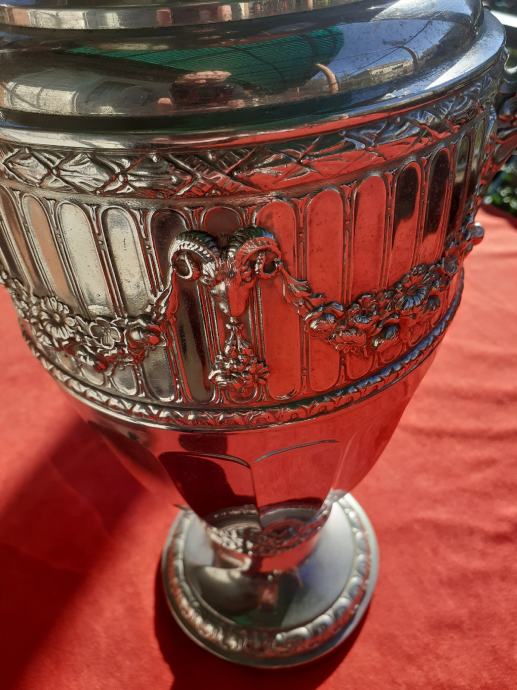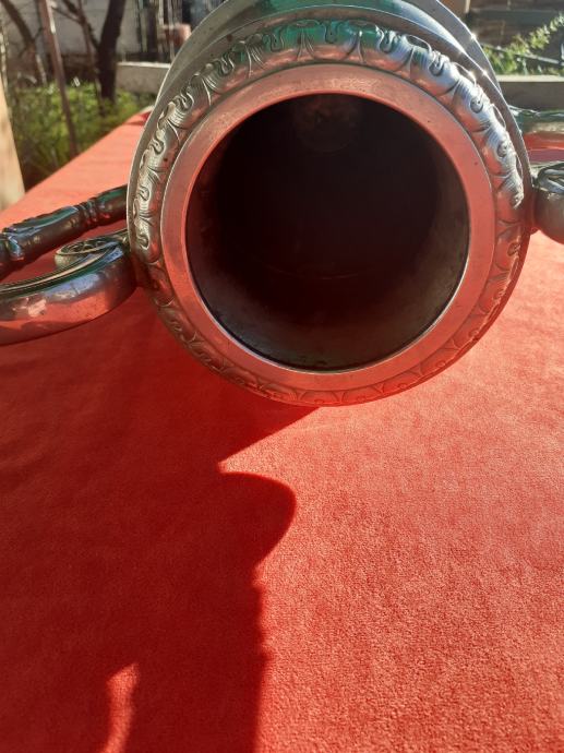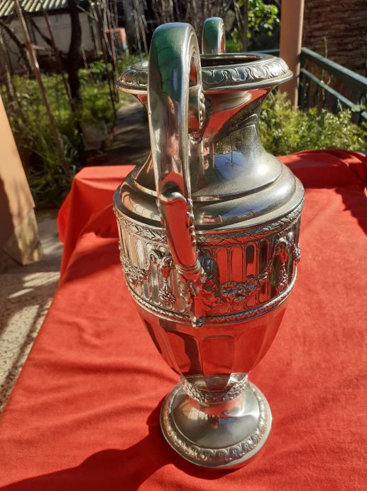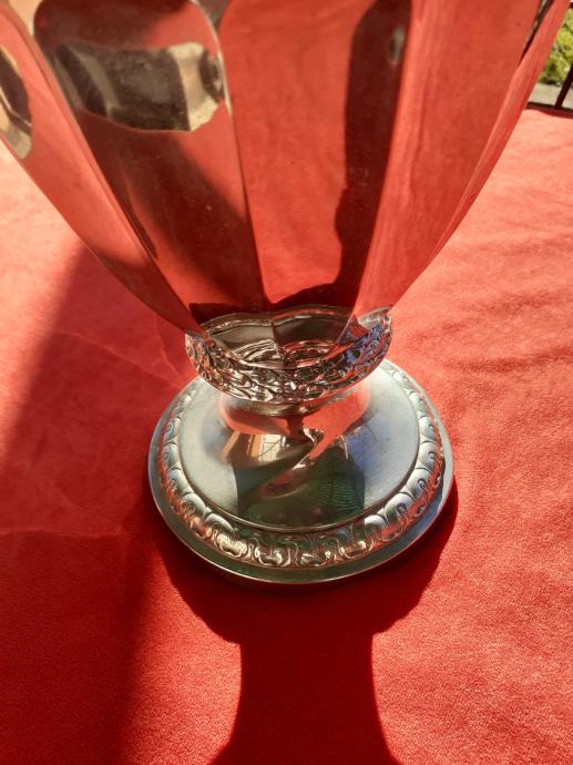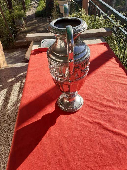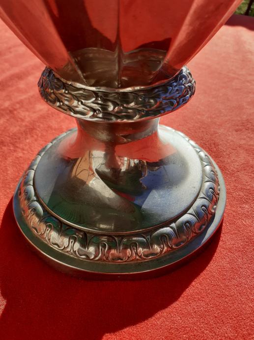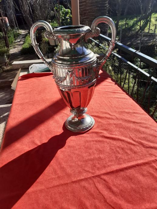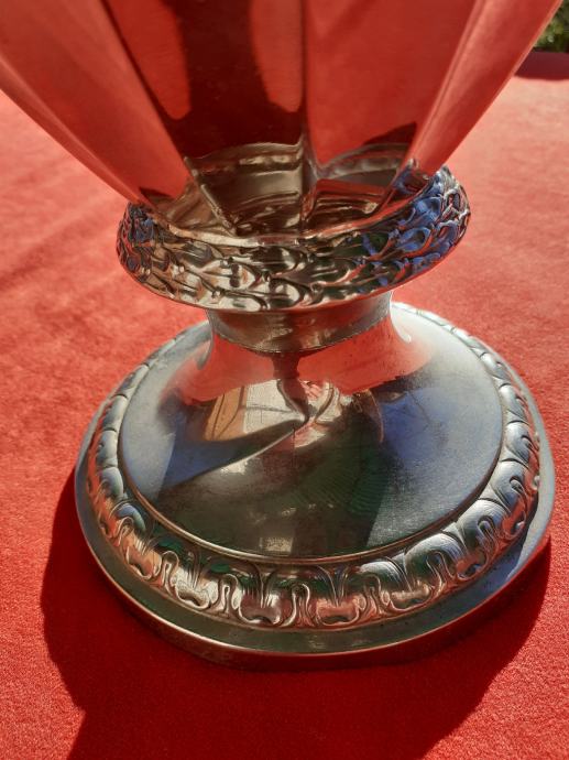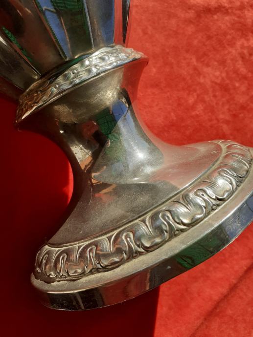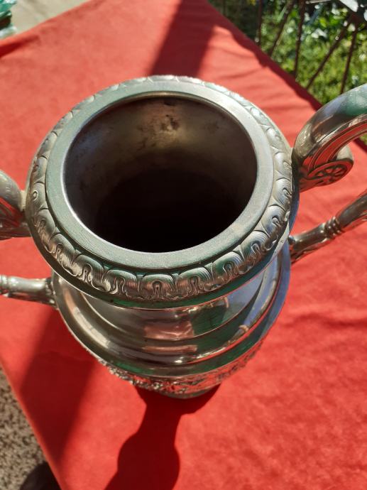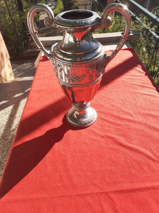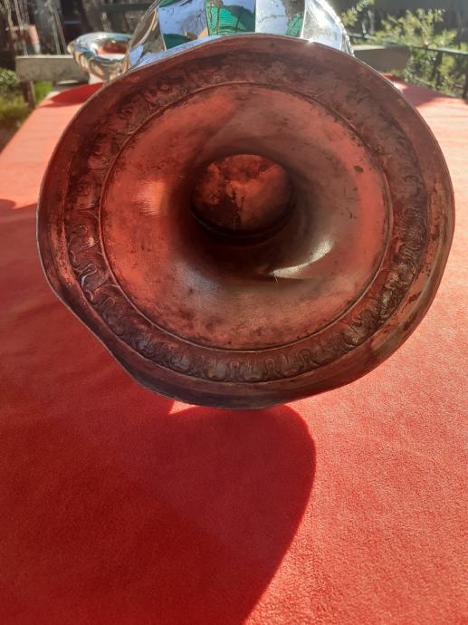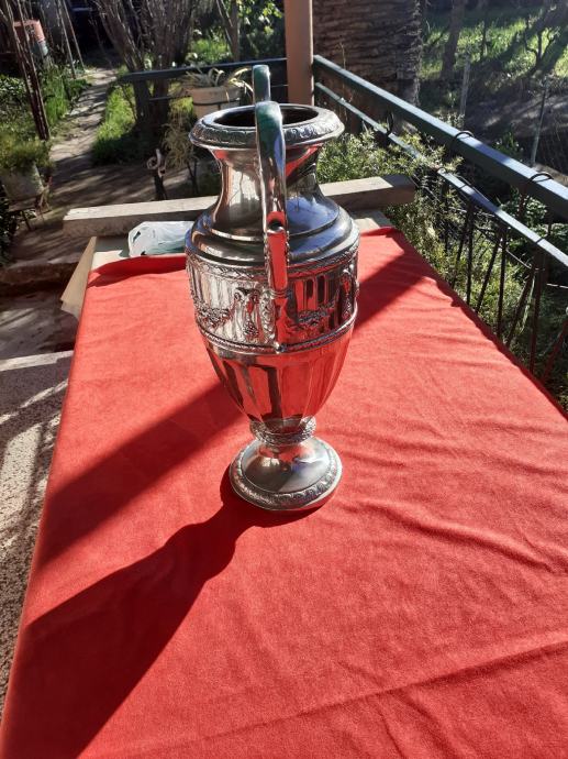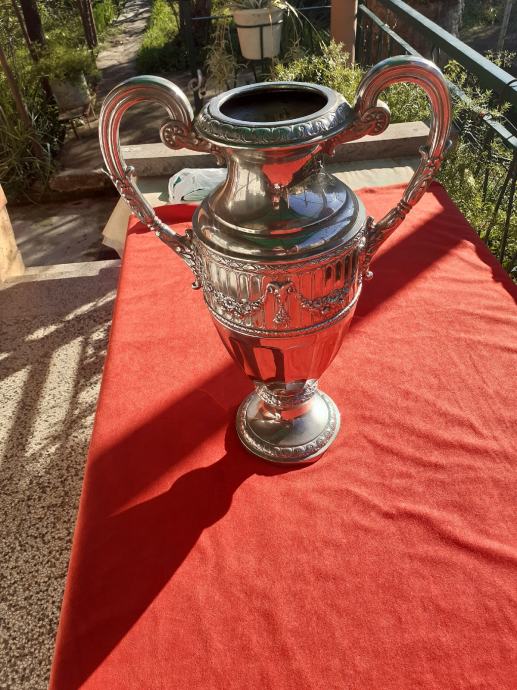 Prodaje se velika metalna vaza visine 45 cm izrađena u historicističkom stilu. Vaza je izrađena moguće od mesinga jer se površinskim struganjem boje nalik na srebrnu u unutarnjem dnu vaze došlo do boje nalik na zlatnu. Utvrđeno je da vaza nije srebrna ni posrebrena. Vaza ima oštećenja u vidu udubljenja i napuknuća na dnu, odnosno površini postolja i iskrivljenjima ruba postolja. Cijena vaze je 186 eura. Mogućnost osobnog preuzimanja u Zadru. Kontakt broj mobitela 091 131 10 36.