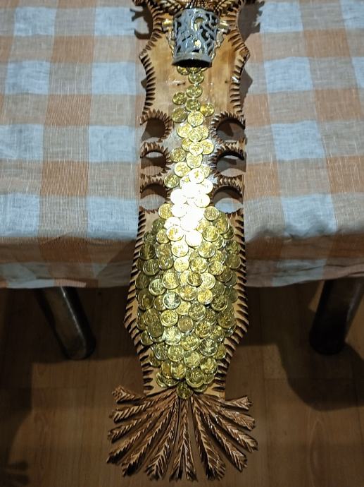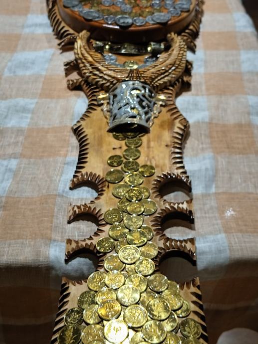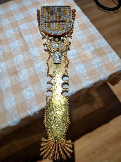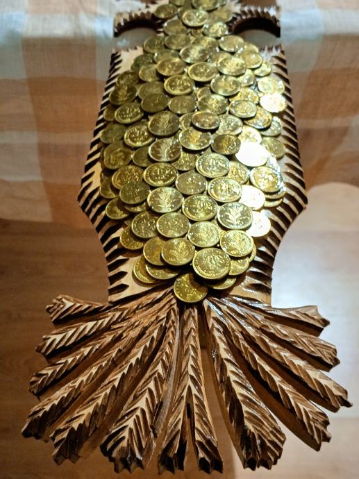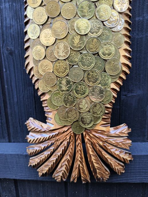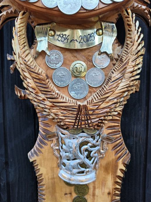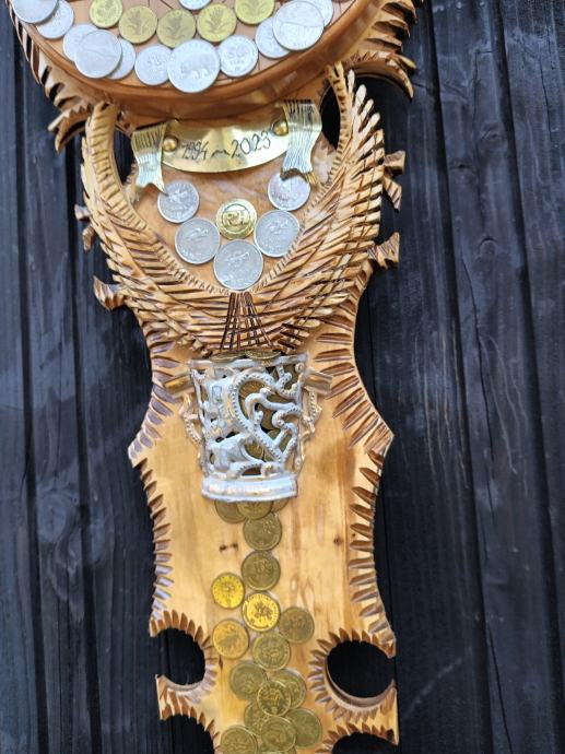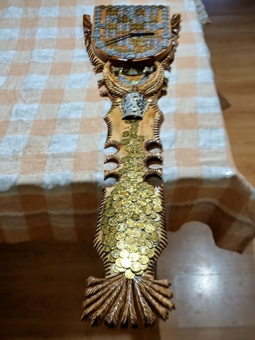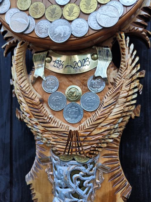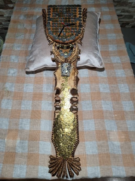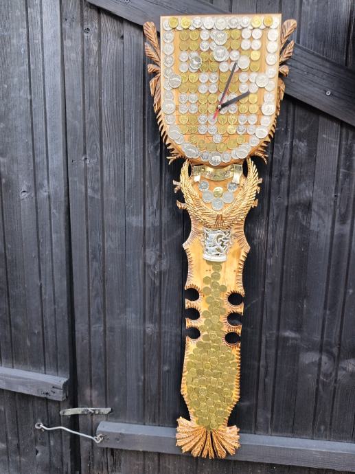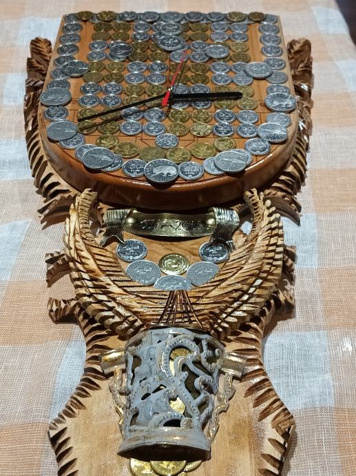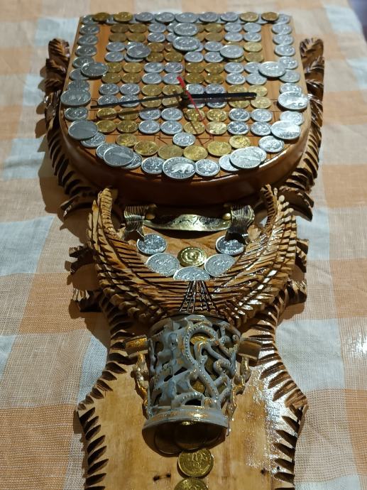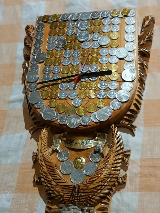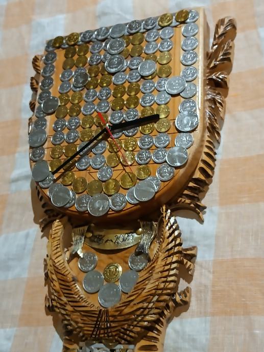 Veliki zidni sat od masivnog drva,ručni rad,svi detalji rađeni ručno,kovanice kuna i lipa na satu, dimenzije jedan metar,debljina drva pet centimetara,širina sata trideset centimetara, kvalitetan satni mehanizam.