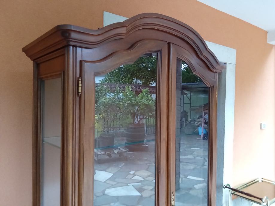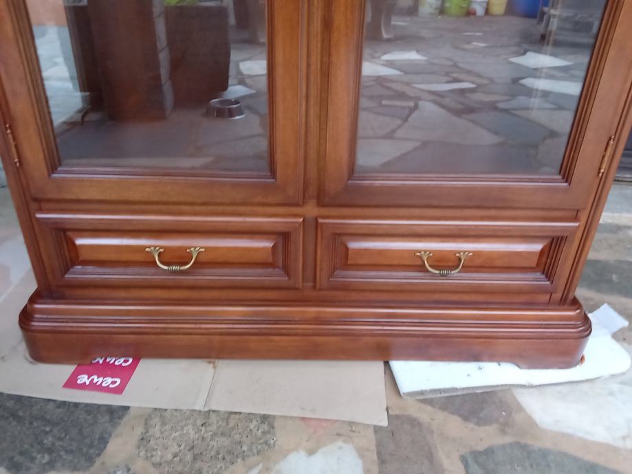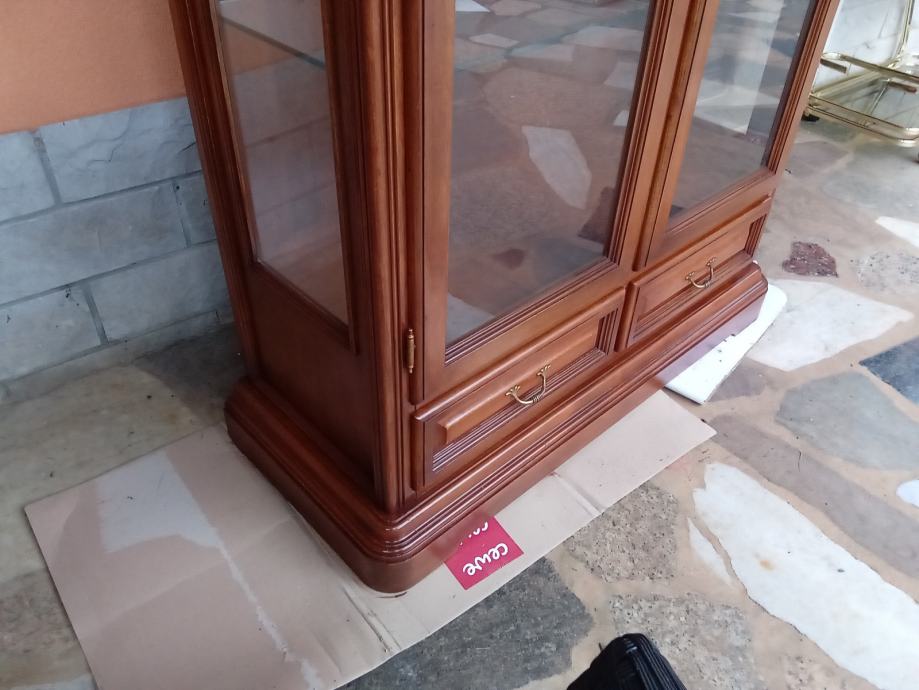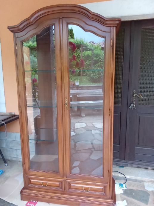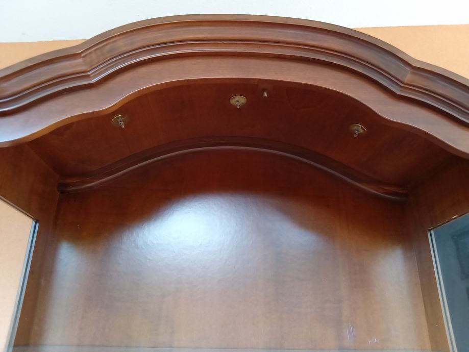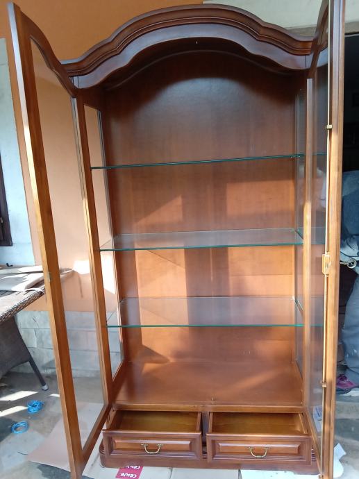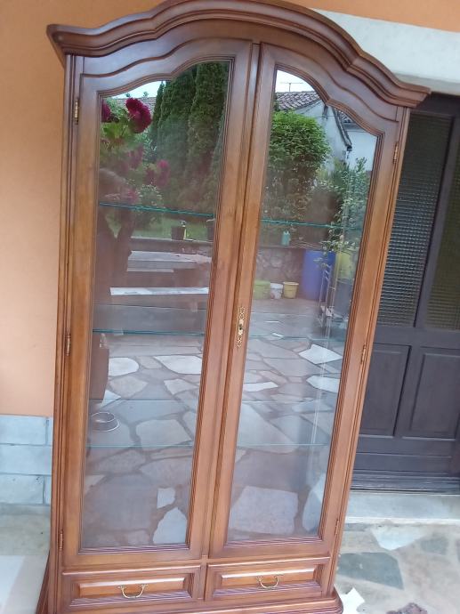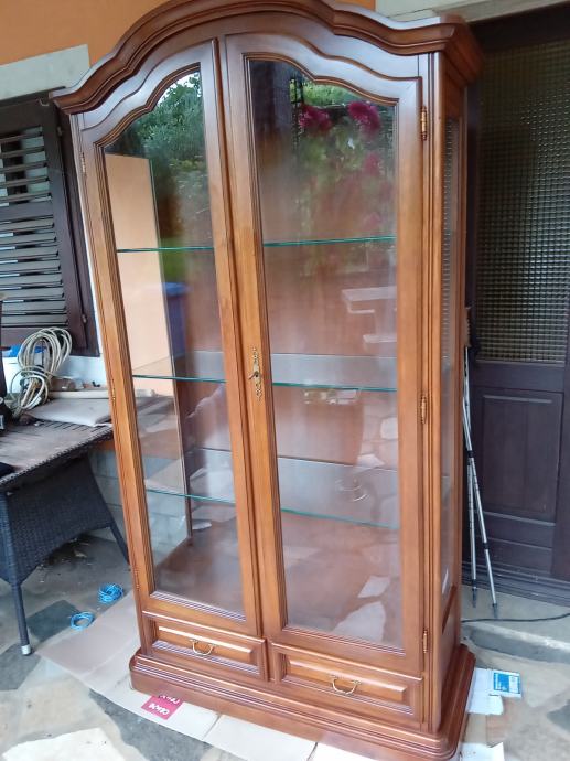Prekrasna hrastova teska kristaljera u odličnom stanju. Kristaljera je osvjetljena. Dimenzije: sirina 97 cm, visina 195 i dubina 43 cm.