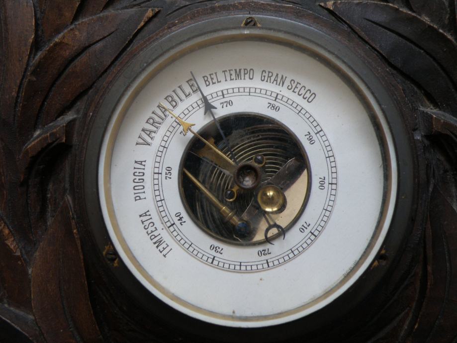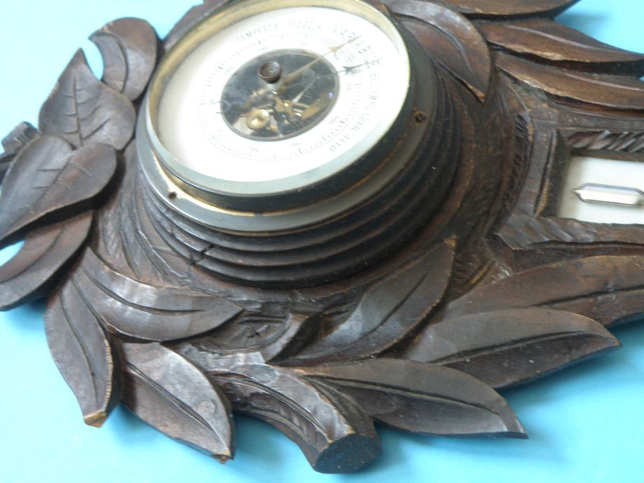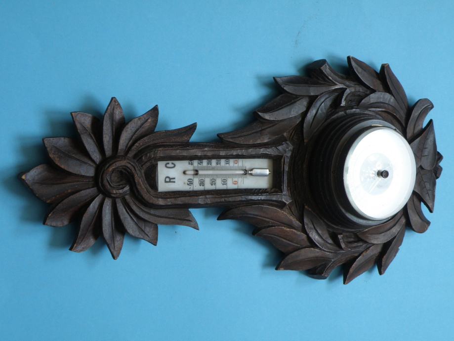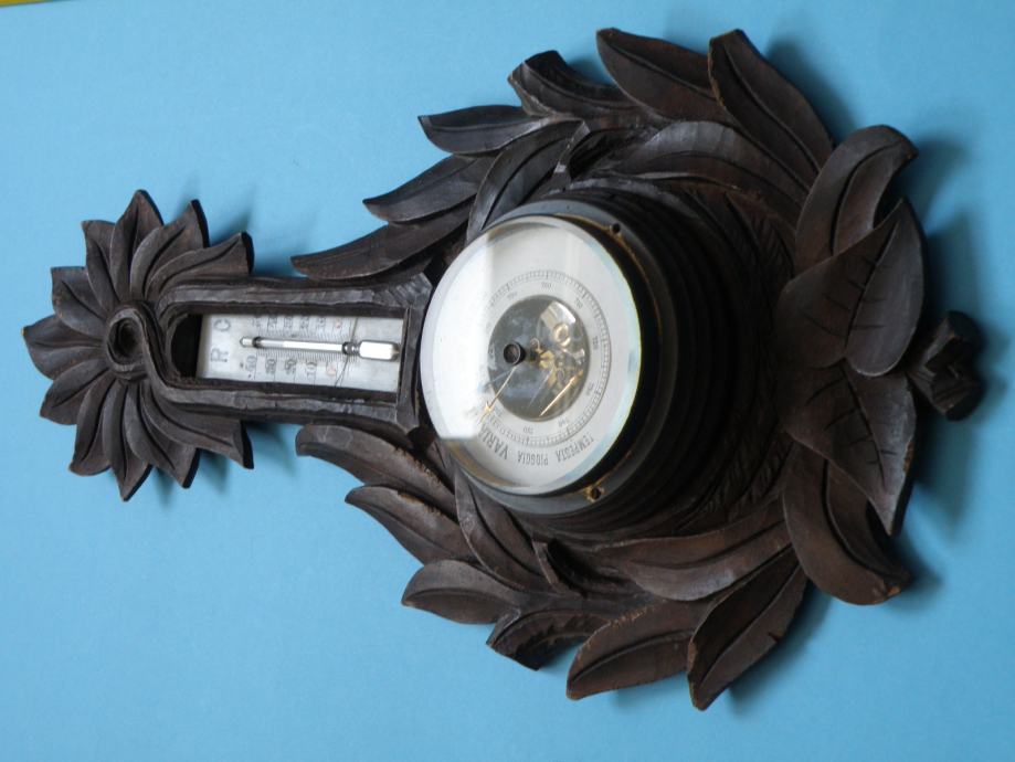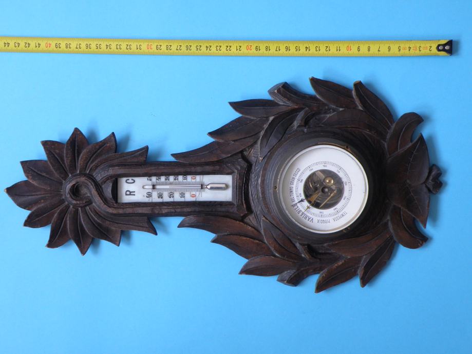 Stari barometar iz vremena dobro očuvan i mehanički ispravan. Podloga je iz drveta a ona je ukrašena sa reljefnim ukrasima u obliku lišča koji su ručno izrezbareni .Dimenzije : 437 X 220mm.