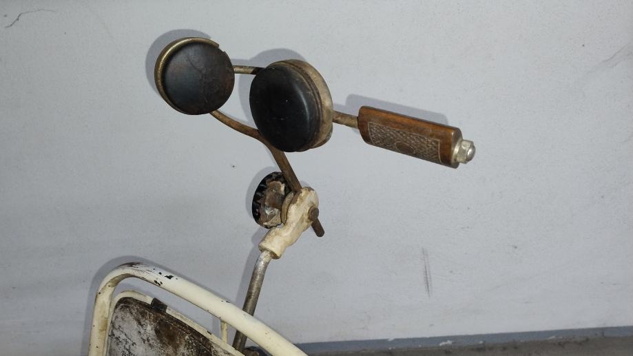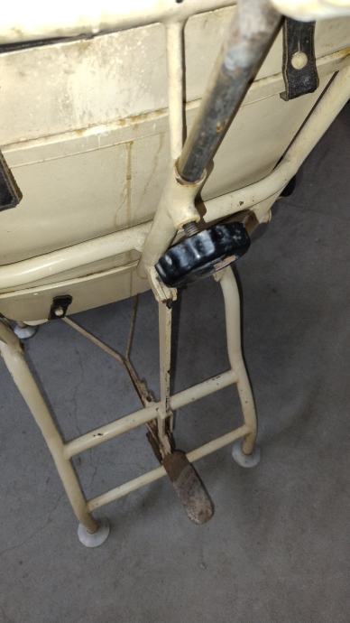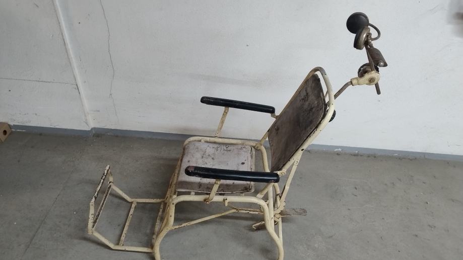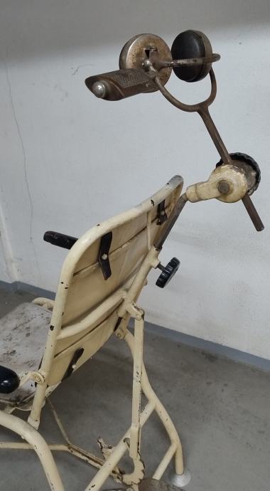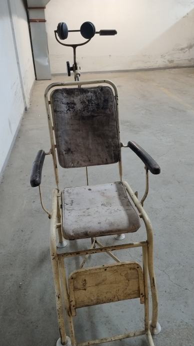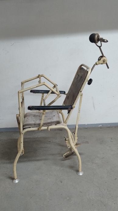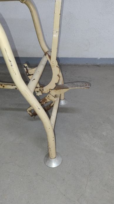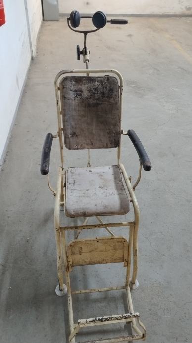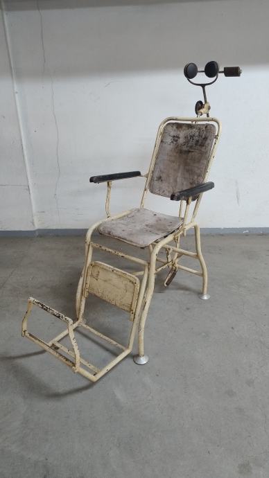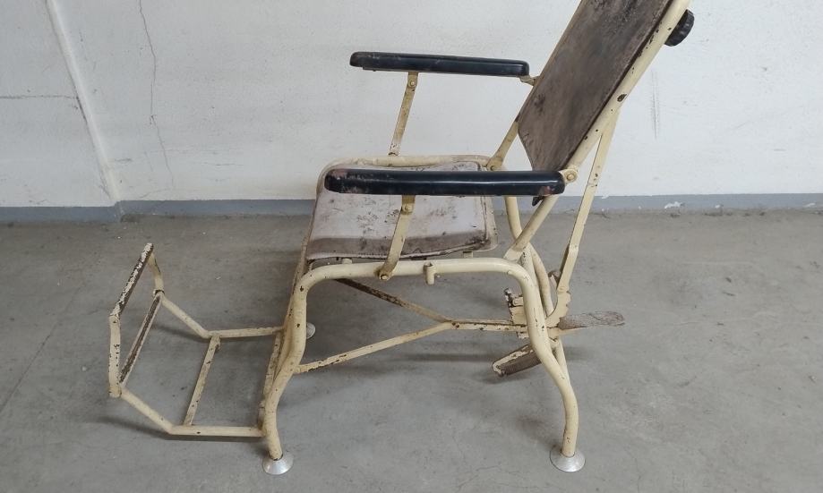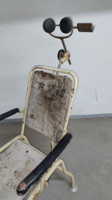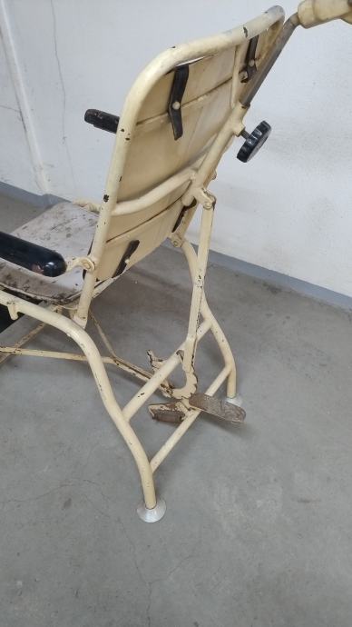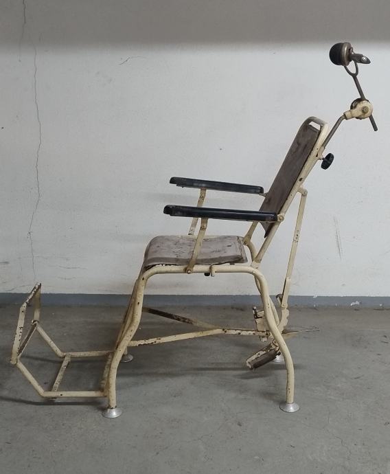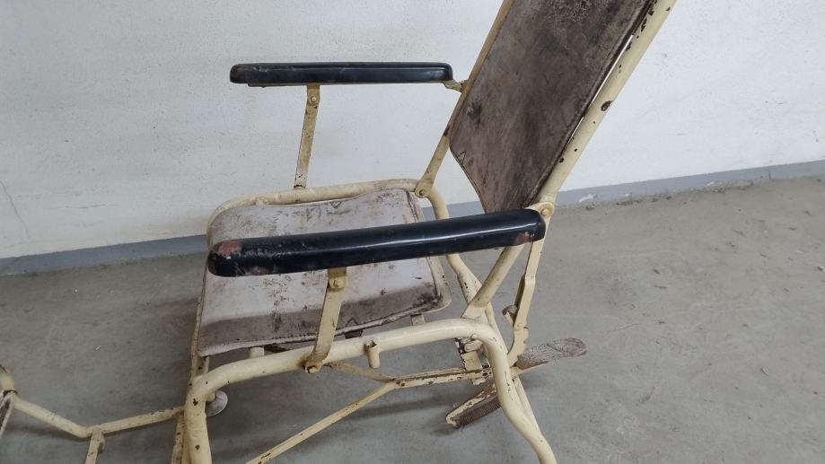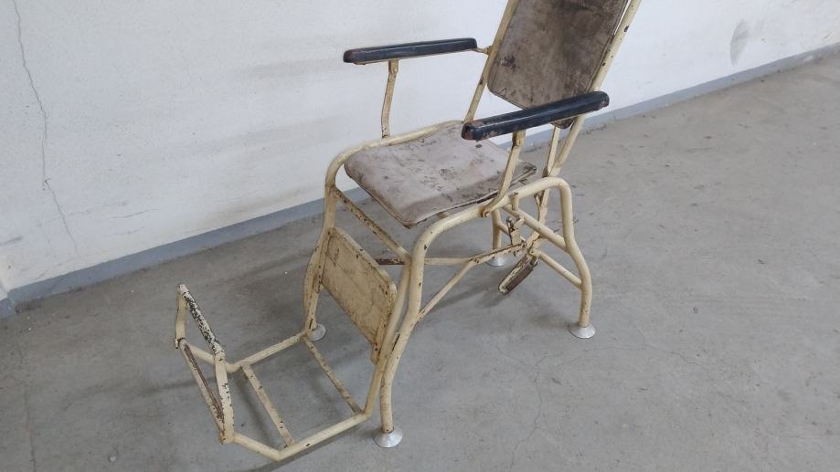 Vintage podesiva metalna zubarska stolica, talijanska proizvodnja, početak 1900-ih. Obojena metalna konstrukcija s tapeciranim sjedalom, naslonima za ruke i glavom. Naslon za leđa podesiv od 90 do 180 stupnjeva sa stražnjom pedalom, podesivi naslon za glavu i noge. Zbog starosti materijal na sjedalu ishaban. Navedene visina i širina su maksimalne visine i širine.