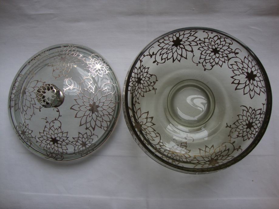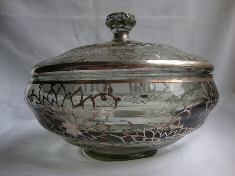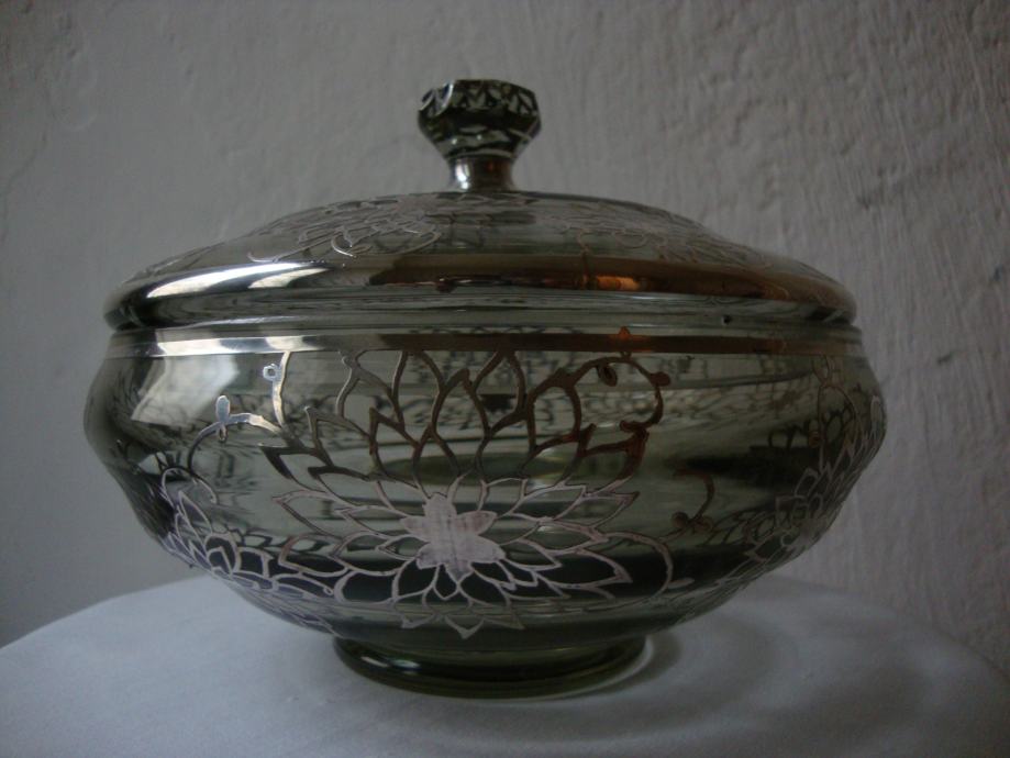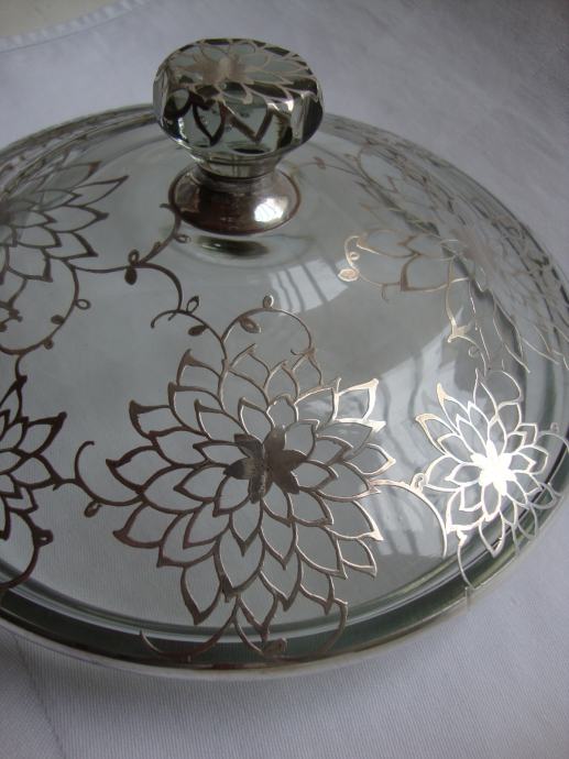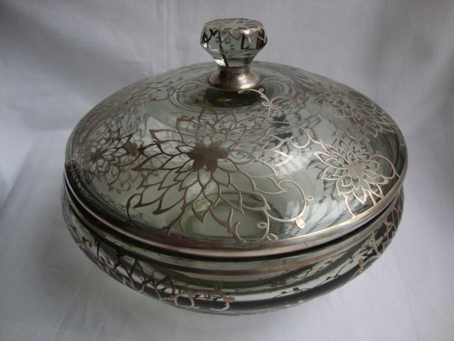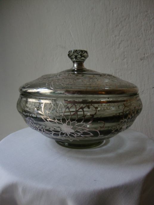 Stara staklena zdijela ili bombonijera pepeljasto sivog stakla ,optočena srebrnom žicom čistoče 925