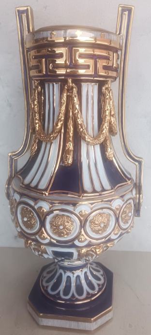 Vaza ima bogate plave, bijele i zlatne ukrase, uključujući vijence i geometrijske uzorke
