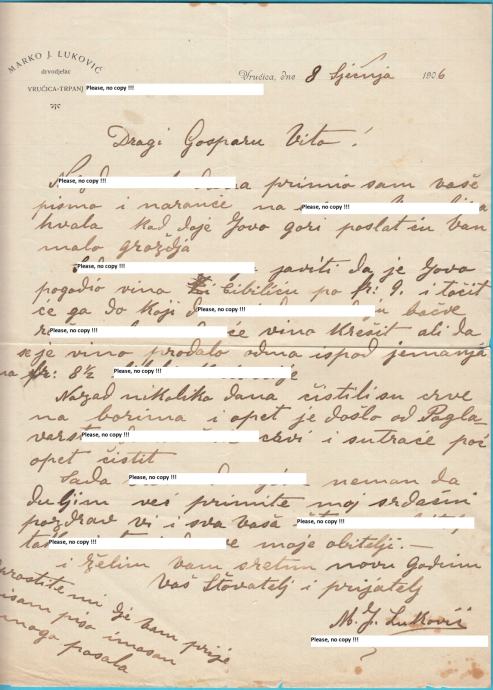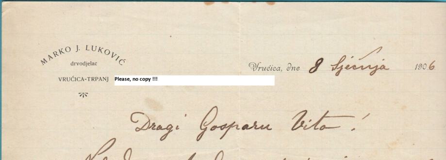 Staro originalno pismo (memorandum) drvodjelca Marka J. Lukovića iz Vrućice - Trpanj na poluotoku Pelješcu iz davne 1906. godine.