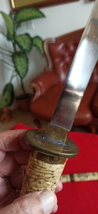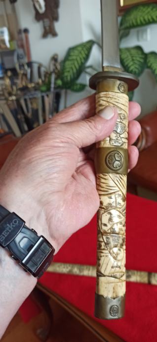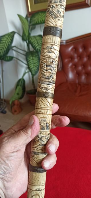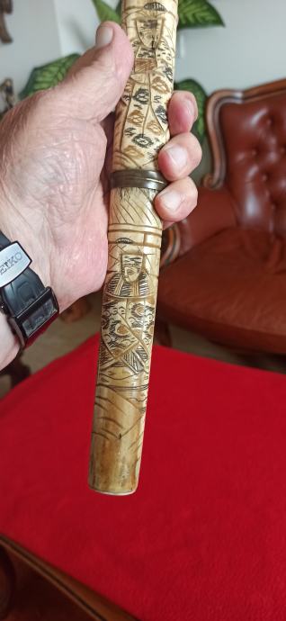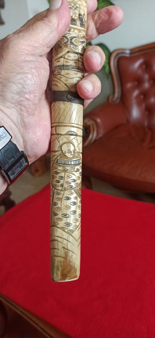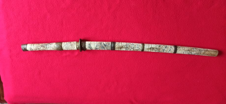 Drška i korice od prirodne kosti, bogato ručno iscrtana i gravirana motivima iz seljačkog života.