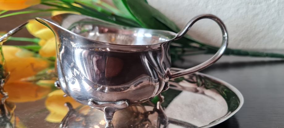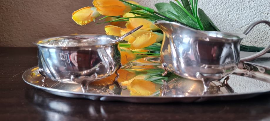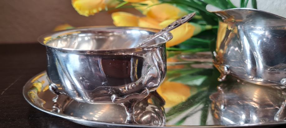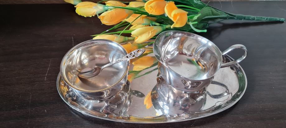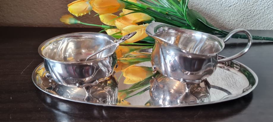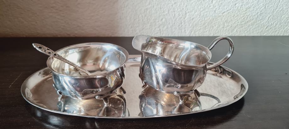 Wmf secesija. Posuda za mlijeko, posude za šećer, te tacna. Uz sve to ide i žlica. Rijedak primjerak, veličanstveni Wmf.