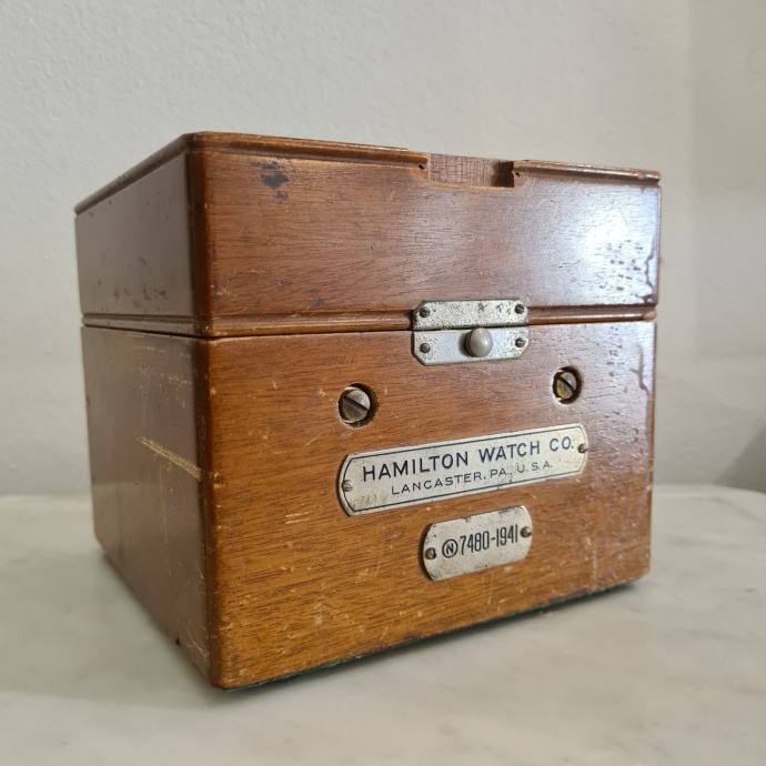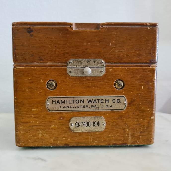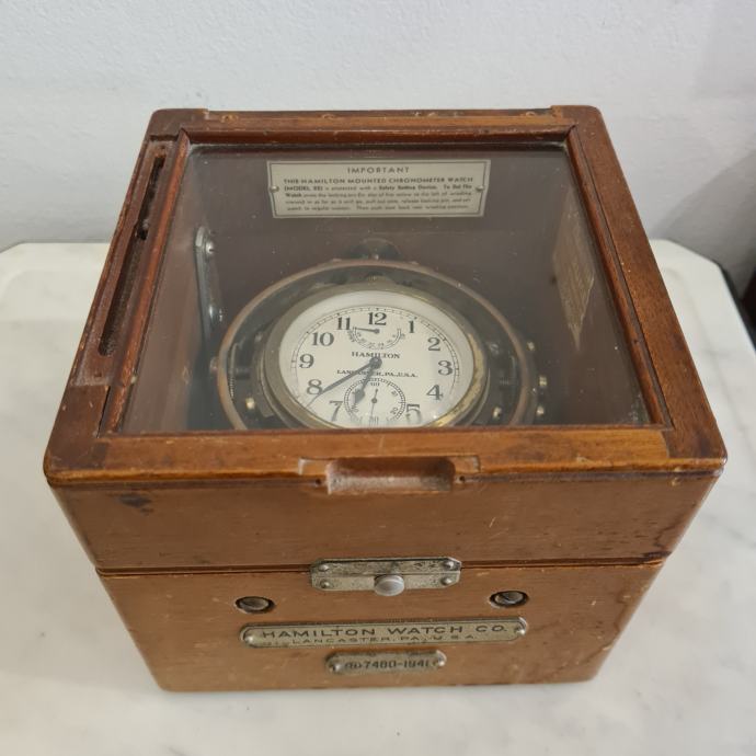Ovaj Hamiltonov kronometar iz Drugog svjetskog rata, koji proizvodi Hamilton Watch Co. u Lancasteru, Pennsylvania, izvrstan je primjer pomorskog mjerenja vremena iz sredine 20. stoljeća. Smješten u originalnu drvenu kutiju, ovaj kronometar ima robusnu konstrukciju od mesinga i bronce s prednjom stranom od prozirnog stakla, s analognim zaslonom. Izrada i materijali, uključujući suptilne zlatne naglaske, odražavaju visoke standarde tog doba.