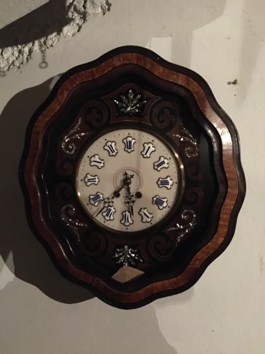 Stari zidni sat,ispravan,kompletan,za godine zavidno stanje,visina58cm--širina50cm,brojčanik promijer25cm