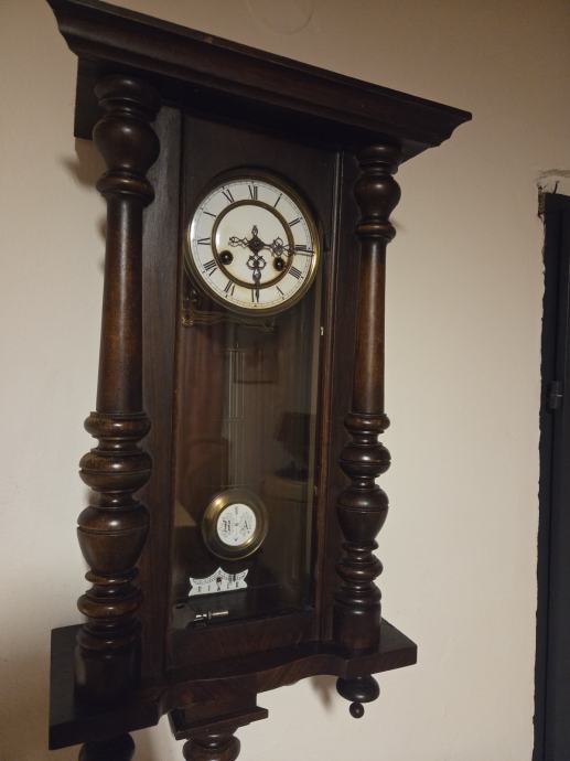 Ispravan zidni sat iz perioda 1940 g. Mehanički mehanizam. Navijač. Posjeduje sopstveni kljuc. Stanje perfekt .Jedino fali kruna i dvije letvice rubne gore kao iz prilozenog na slikama. Dimenzije 74/38/16.5 cm.