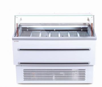 Vitrina za sladoled opremljena je sa 7 x 7 komada plastičnih posuda (7 ispod, 7 iznad), ugrađeni agregat, električno otapanje, dinamičko hlađenje, digitalni termostat, rasvjetom.