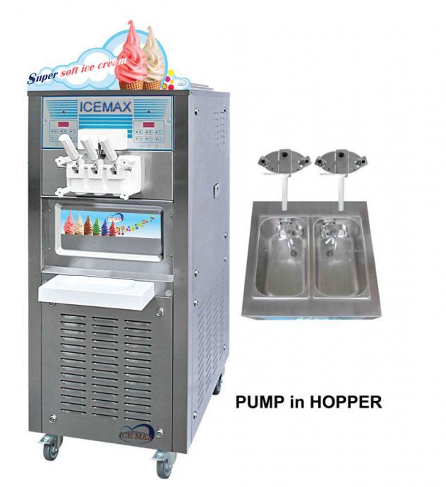 Samostojeći aparat za sladoled za serviranje mekog sladoleda na točenje.Prethlađenje,pumpe za dodatno ubacivanje zraka u sladolednu masu,380V.3F,elektroničke postavke,2 motora,3 kompresora...