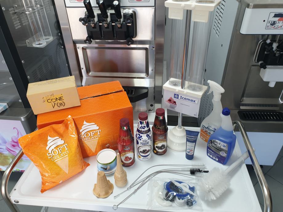 Uz mašinu se dobije promo paket na slici 5.(comprital&Fabri smjesa za kvalitetan Ital soft ice,držač korneta,kompletan alat za upravljanje strojem,upute,lubri,četkice,korneti,šalice,žličice)