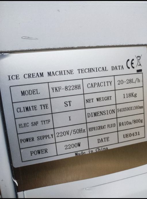 Za prodaju novi samostojeći aparat za točeni sladoled.visine nekih 135cm.kapacitet posuda za pripremu je 2 x 6 litara (12 litara). kapacitet proizvodnje je 20-28 L / sat.stroj pravi odličan sladoled a može se kod mene i isprobati.nalazi se u Bizovcu, 20 km od Osijeka prema Zagrebu.moguća dostava.cijena je 3 200€.broj za dodatne informacije je 091/885-7051
