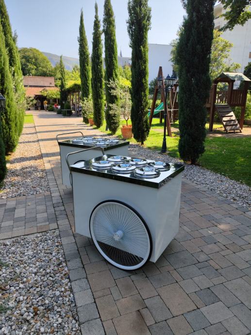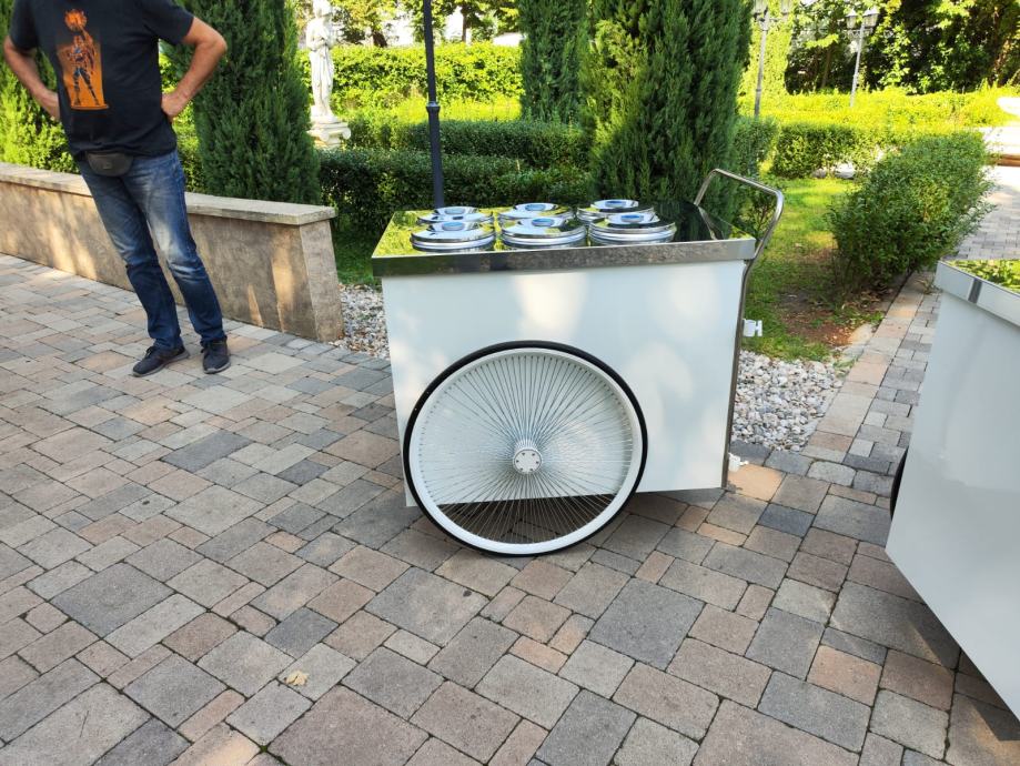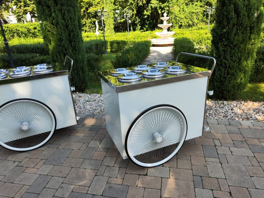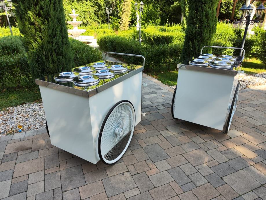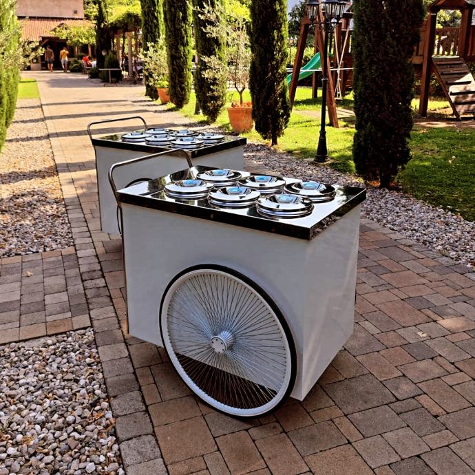 U ponudi su rashladna kolica za zanatski sladoled u karapinama. Predvidjena za cilindricne karapine dimenzija 200x250h sa mestom za 6 ukusa. Poseduju skriveni agregat prilagodjen teskim uslovima rada koji garantuje sigurnost odrzavanja idealne temperature sladoleda za savrseno serviranje. Tockovi su originalni sa punim gumama i bez potrebnog ikakvog odrzavanja.