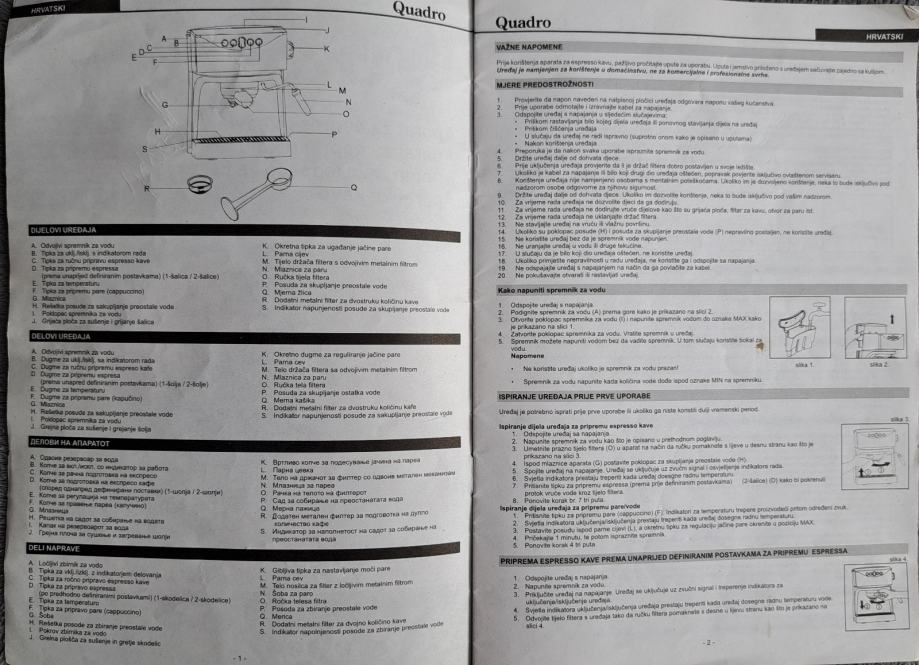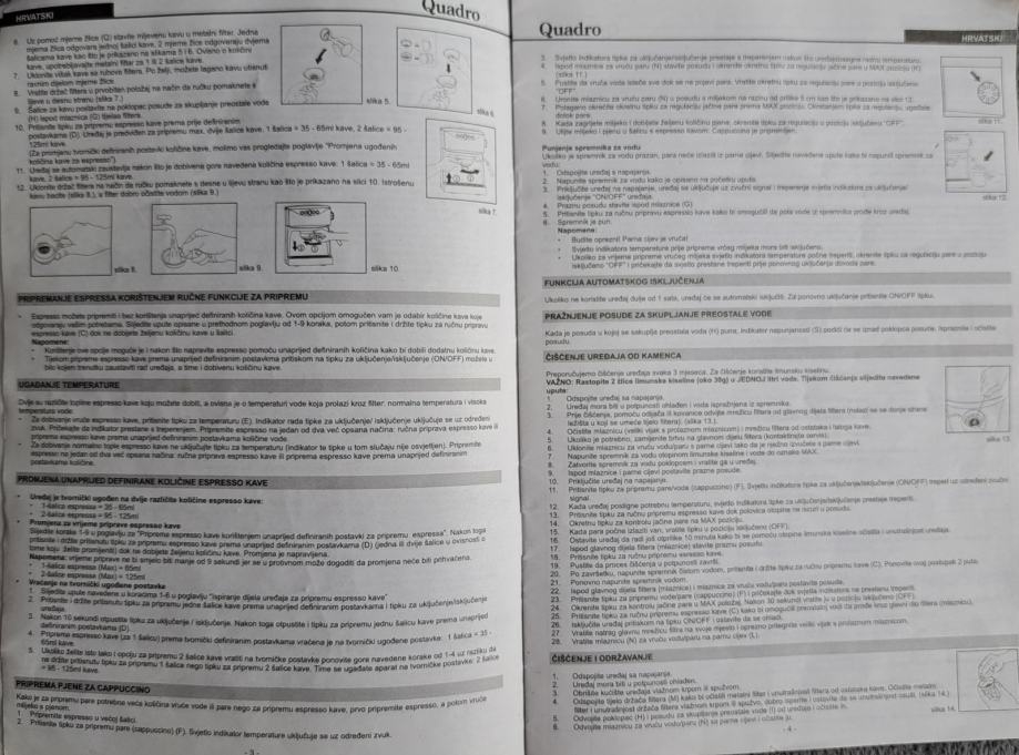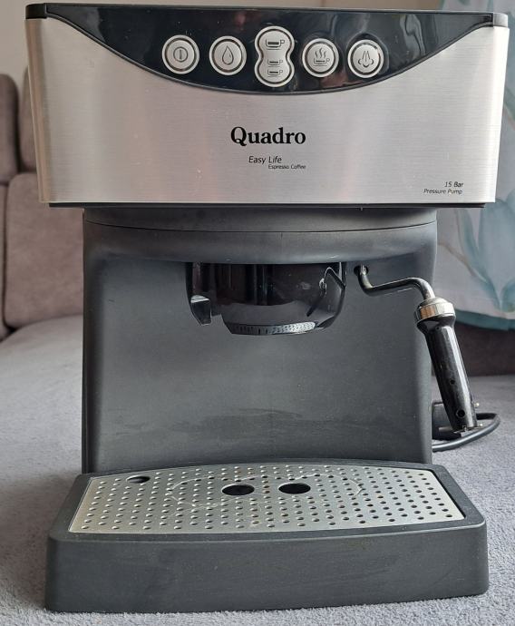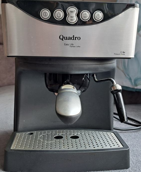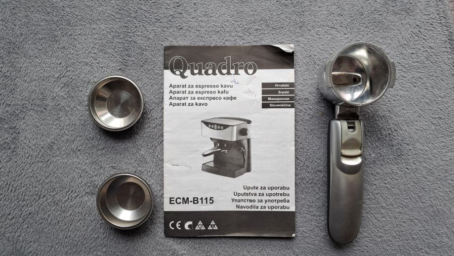 Prodajem potpuno ispravan aparat za espresso kavu Quadro ECM-B115. Aparat je korišten samo nekoliko puta, ali vlasnik nije ljubitelj espressa pa je završio u kutiji i godinama stajao nekorišten. U aparat se stavlja mljevena espresso kava. Pjenjač za mlijeko za cappuccino i macchiato. Dolazi s original uputama za korištenje.