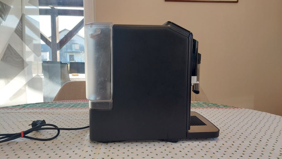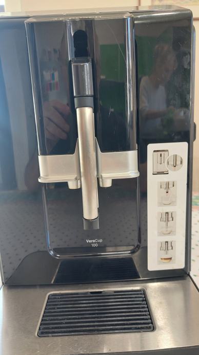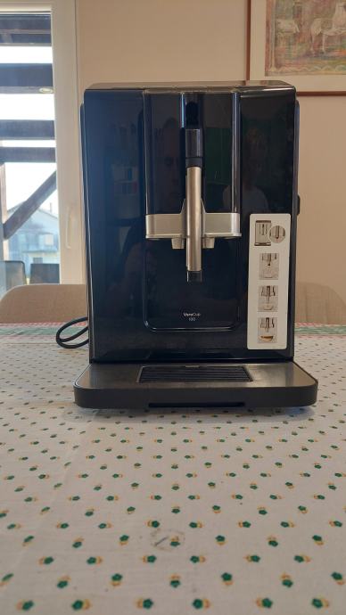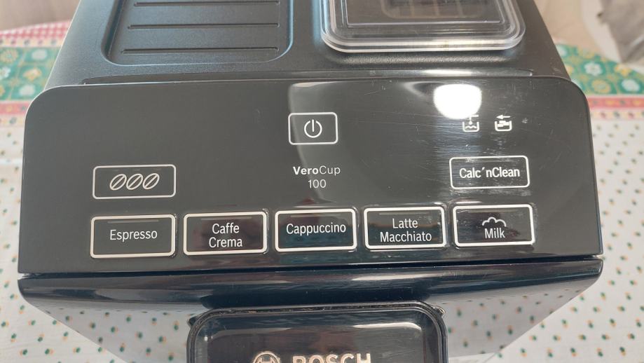 Automatski aparat za espresso kavu Bosch Vero Cup 100. Ispravan i uščuvan. Očišćen od kamenca. U aparat se stavlja espresso kava u zrnu. Dodirom na jedan gumb automatski kuha kratku ili dugu kavu, cappuccino ili macchiato. Upute (pdf).