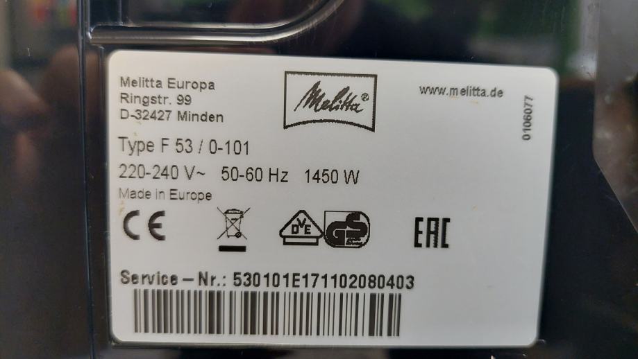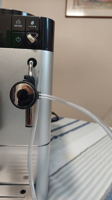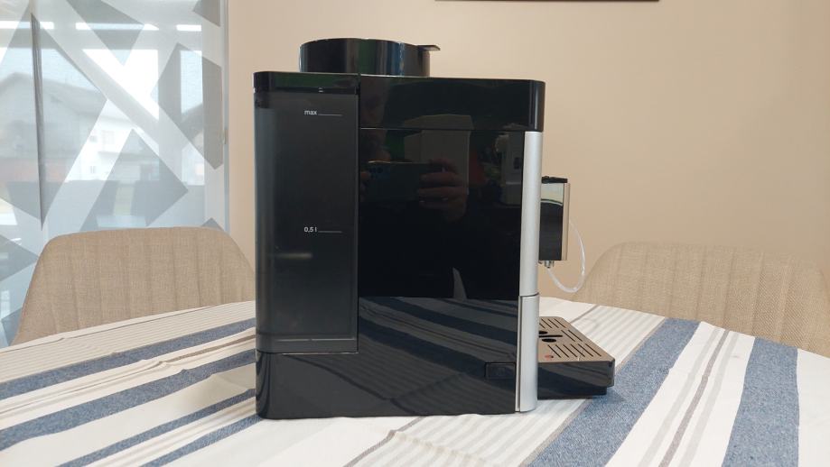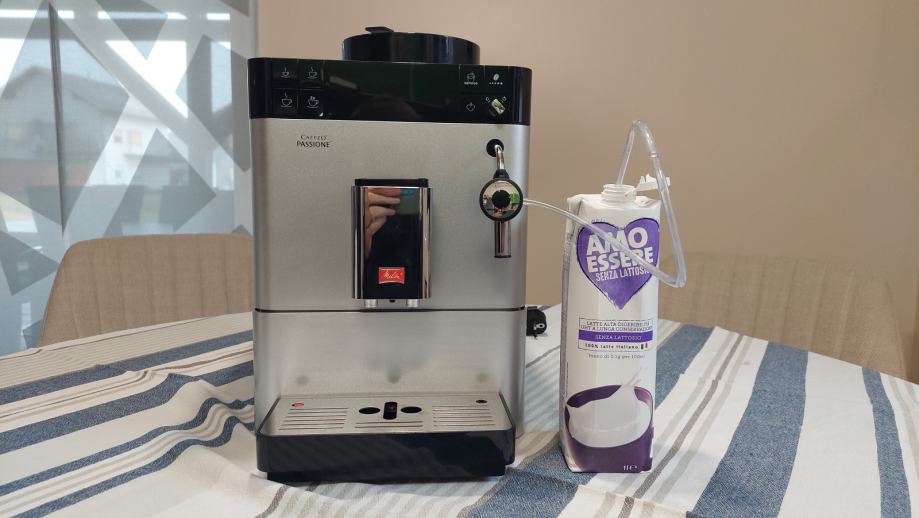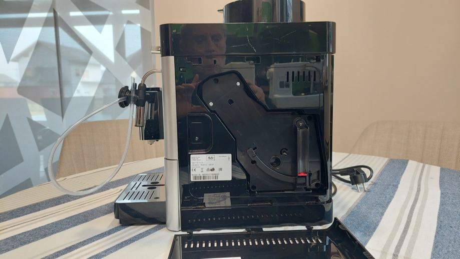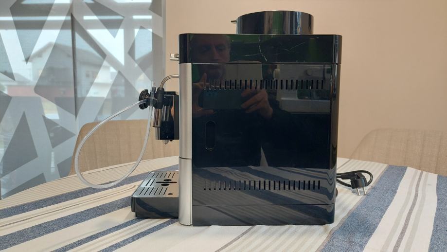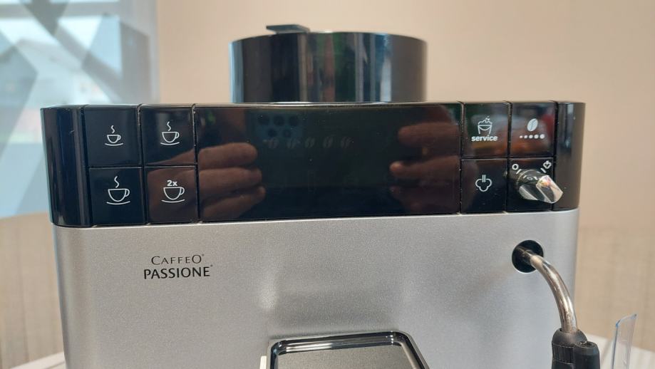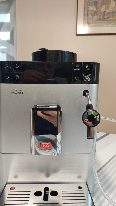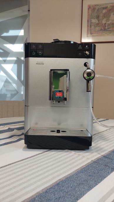 Automatski aparat za espresso kavu Melitta Caffeo Passione. Potpuno ispravan, uredan i čist, očišćen od kamenca. U aparat se stavlja espresso kava u zrnu, ima ugrađen mlinac za kavu. Pjenjač za mlijeko za cappuccino ili macchiato vuče mlijeko direktno iz tetrapaka ili posude.
