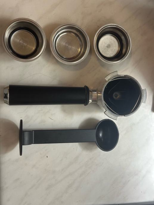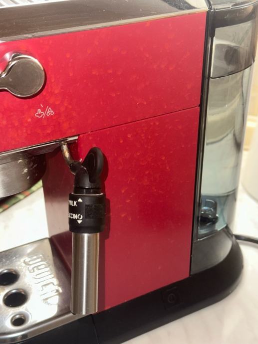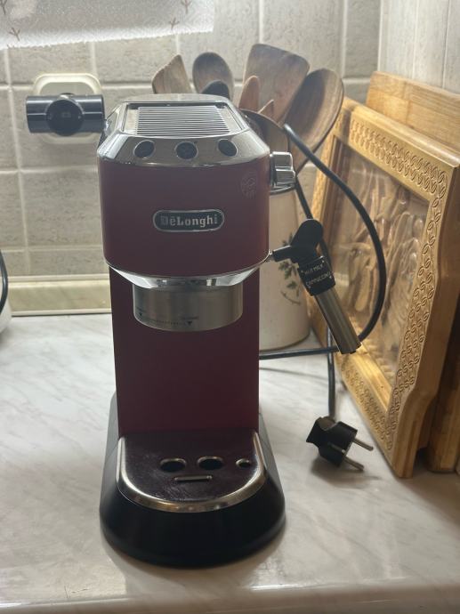 Prodajem DeLonghi Dedica aparat za kavu u crvenoj boji s metalnim detaljima. Radi se o kompaktnom espresso aparatu koji ima ugrađenu mlaznici za paru za pripremu mlijeka. Spremnik za vodu nalazi se iza.