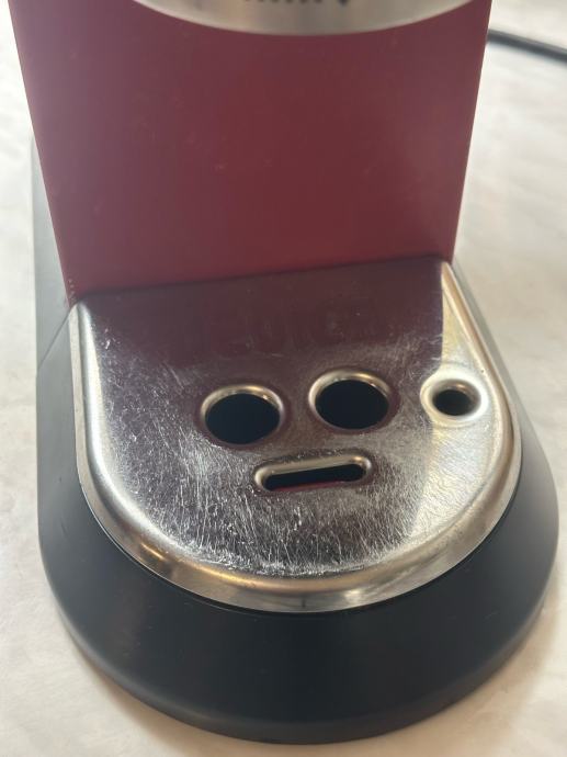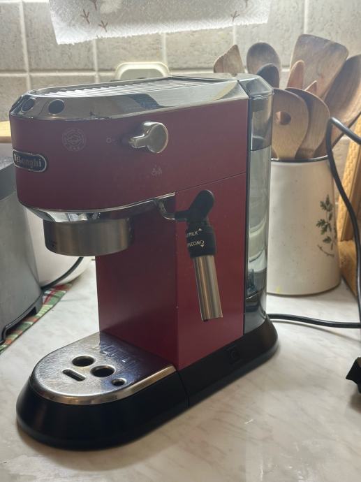 Prodajem DeLonghi Dedica aparat za kavu u crvenoj boji s chrome detaljima. Radi se o kompaktnom espresso aparatu s ručicom za portafilter i mlaznicom za parenje mlijeka. Aparat je rabljen.