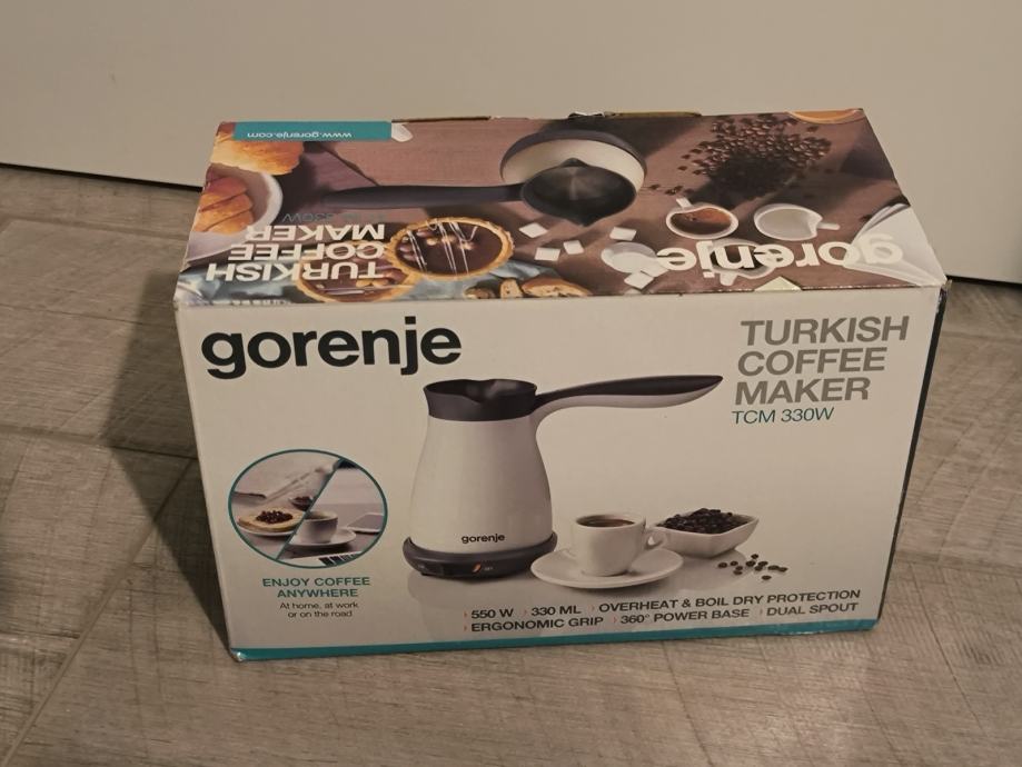 Gorenje TCM330W, električno kuhalo za tursku kavu kapaciteta 330ml i snage 550W. Uređaj je bijele boje s ergonomskom ručkom i zaštitom od pregrijavanja. Idealno za brzu i jednostavnu pripremu turske kave ili zagrijavanje vode.