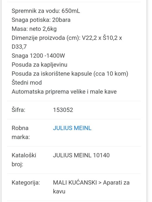 Prodajem potpuno novi ne korišten Julius aparat za kavu u kapsulama (koje se mogu kupiti u svim centrima). Imamo već jedan, odlična kava. Ovaj raspakiran samo za slikanje, a uz orginal pakiranje biće i nešto gratisa za ozbiljne kupce. Mogućnost besplatne dostave uz dogovor za Slavoniju.