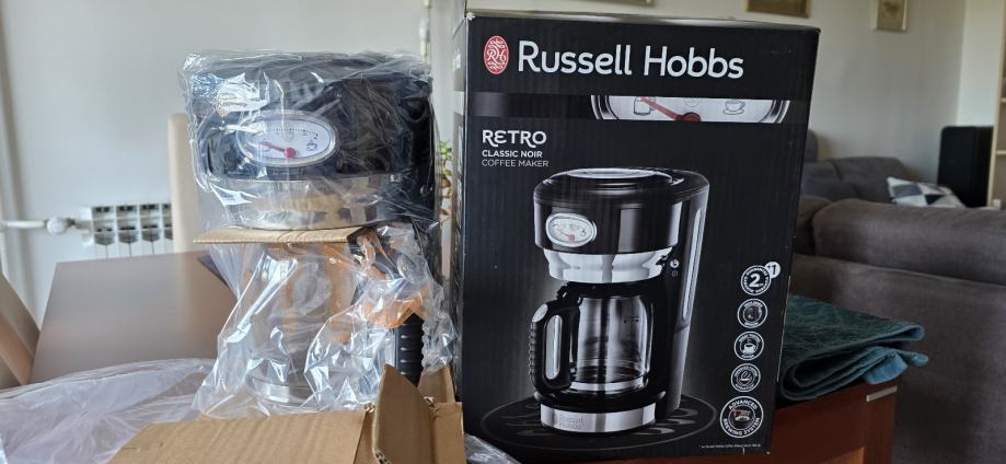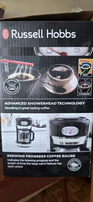 Russel Hobbs Retro aparat za kavu koristi naprednu tehnologiju tijekom kuhanja, koja osigurava bolju ekstrakciju i time osigurava savršenu aromu i sofisticiran okus. Učinkovito raspršuje vodu preko cijele površine zrna kave u filteru za potpunu učinkovitost. Isporučuje se s praktičnom mjernom žlicom za jednu šalicu kave tako da kava uvijek bude savršena. Funkcija zaustavljanja i ulijevanja zaustavlja proces kuhanja za ulijevanje svježe kave. Šalica od 1,25 L prima do 10 šalica kave i održava ih toplima uz funkciju zadržavanja topline.