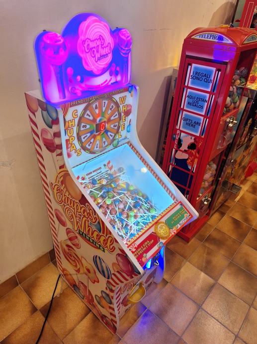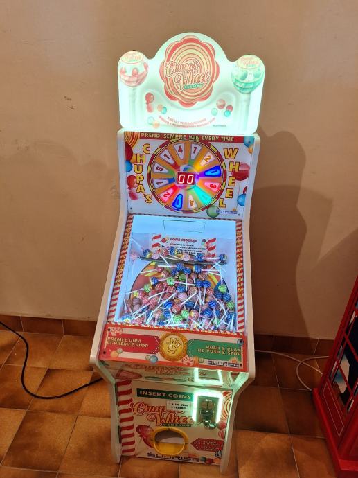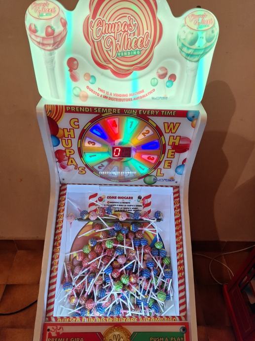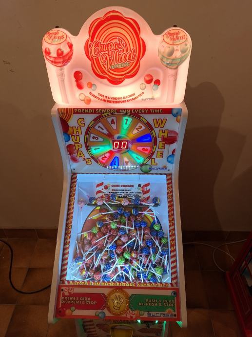 Dječji automat koji nakon ubačene kovanice od 1 € zavrti svjetleči kotačič koji označuje koliko če lizalica ispasti 1, 2 ili 3 komada.