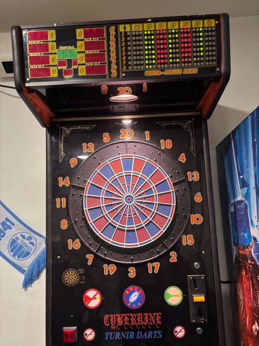 Prodajem Cyberdine profesionalni pikado aparat. Radi se o automatu za pikado s elektronskim praćenjem rezultata i digitalnim zaslonom. Aparat je kabinskog tipa s kvalitetnom konstrukcijom i omogućava zabavu za više igrača. Na zaslonu se prati rezultat i statistika igre, a uređaj sadrži klasičnu pikado metu s elektronskim senzorima za automatsko brojanje bodova. Praktičan je za kafići, barove ili prostorije za zabavu gdje je potreban robustan i funkcionalan aparat za pikado.