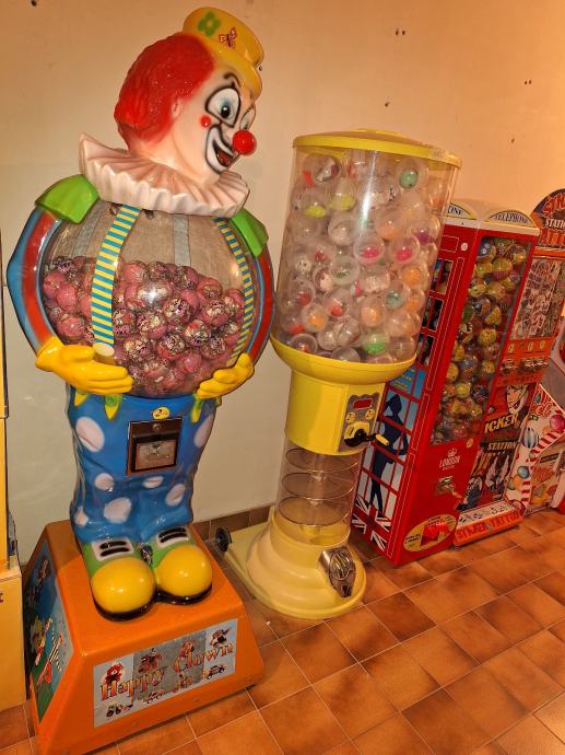 Automat za prodaju kugli iznenađenja atraktivnog izgleda radi na kovanice od 2€ i izbacuje kugle promjera 60 mm raznim igračkama za mališane.