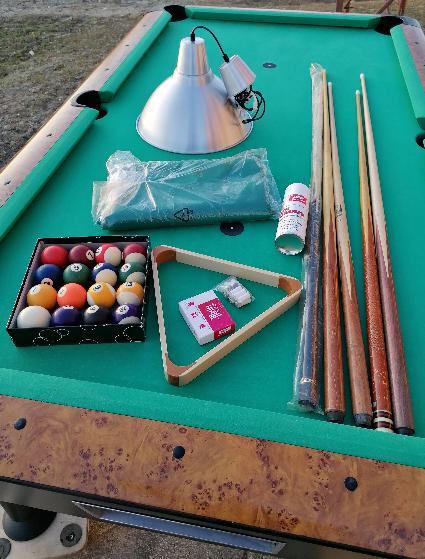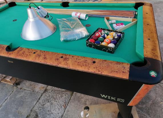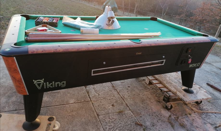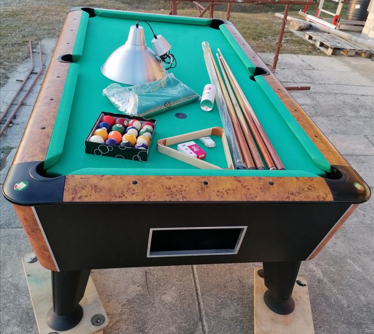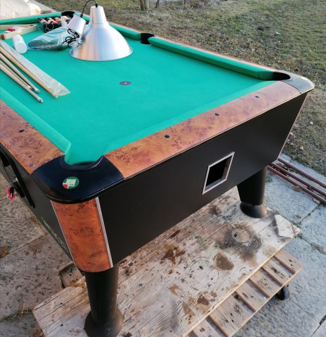 Biljar Wik vel. 7 ft. novi model. Stol je u dobrom stanju, novo presvučen dolazi sa opremom sa slika ( 5 kom štapova, trokut, kugle, lampa, rez. kapice, krede, četka za čišćenje platna,baterija, žetonjera radi na kovanice 1,00 eur. Cijena je fix. 1400,00 eur.
