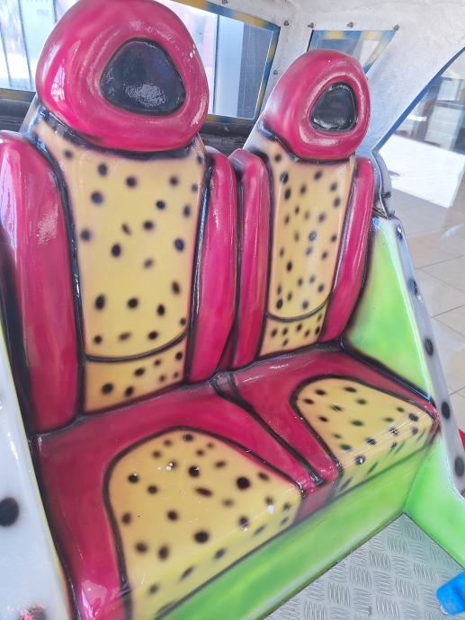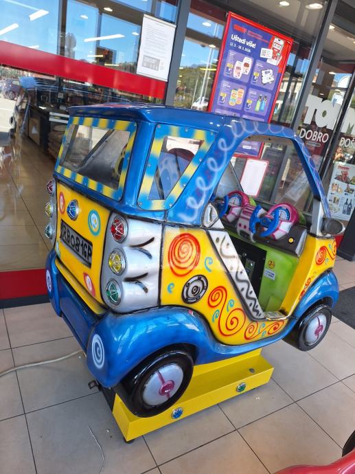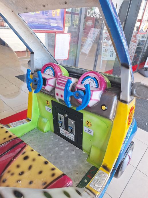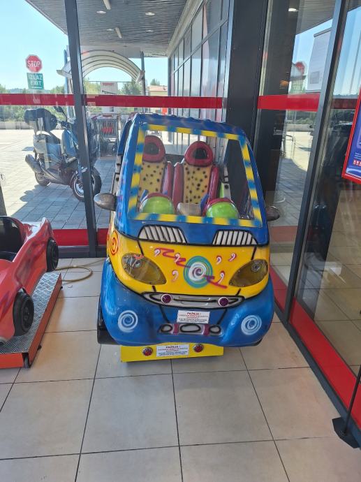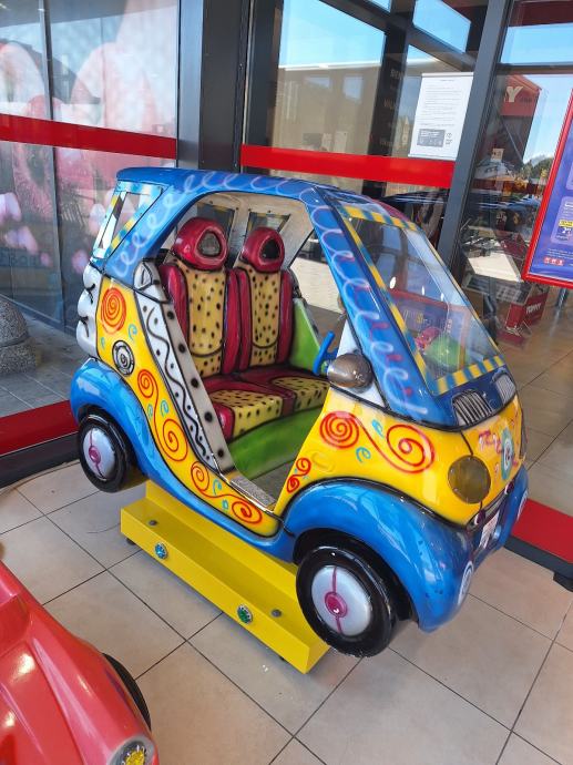Prodajem kiddie ride u obliku Smart automobila za dvoje djece. Radi se o ugostiteljskom automatu za zabavu koji se postavlja u trgovačke centre, ugostiteljske objekte i slične prostore. Kabina prima dvoje djece koji sjede jedan pored drugog. Šareni dizajn s motivima u plavoj, žutoj i crvenoj boji čini ga lako uočljivim u prostoru. Radi na kovanice od 2€.