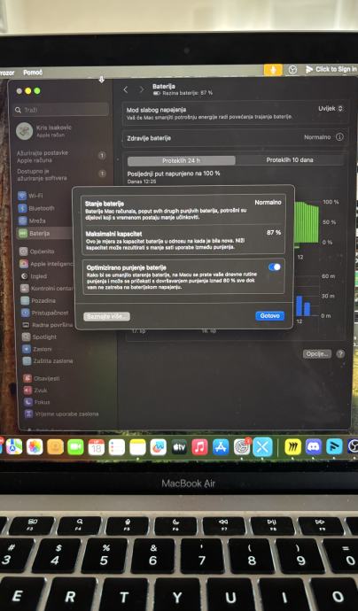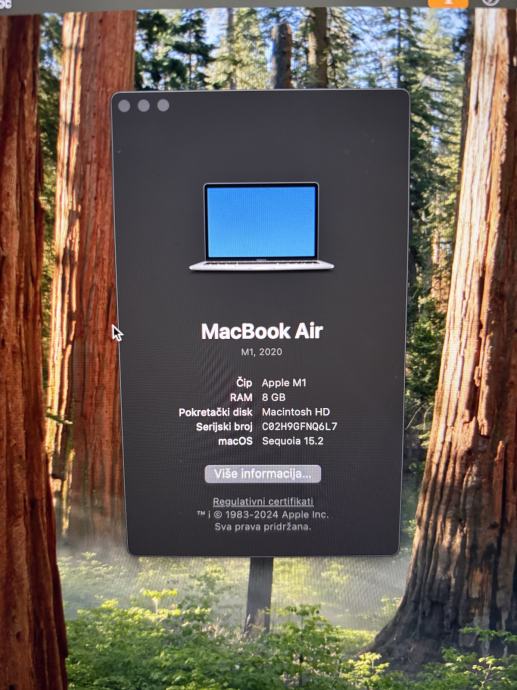 Prodajem temeljno ociscen MacBook Air s M1 cipom, kupljen prije nesto vise od 2 godine. Uredaj je u izvrsnom stanju, koristen je vrlo pazljivo te strogo poslovno. Ima 8 GB RAM-a i 256 GB SSD memorije, a zaslon je 13,3" Retina. Baterija je vrlo solidna (zdravlje baterije 87%) te drži do 10 sati u kontinuiranom korištenju. Sve radi besprijekorno, te uz uredaj dolazi originalni punjač i kutija. Mazen i pazen do dana dok nije kupljen novi laptop