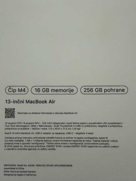 Prodajem novi Apple MacBook Air s čipom M4, 13-inčni model s 16 GB memorije i 256 GB pohrane. Ekran je 13,6-inčni Liquid Retina zaslon s rezolucijom 2560 x 1664 piksela i True Tone tehnologijom. Laptop dolazi s USB-C adapterom za napajanje i MagSafe 3 kabelom, a ima dvije Thunderbolt 4 priključnice, dvije USB-C priključnice te priključnicu za slušalice. Dimenzije su 30,41 x 21,5 cm.