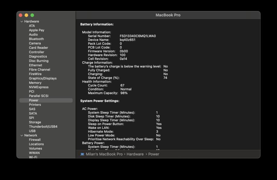 Baterija u odličnom stanju. Maximum Capacity: 98% Cycle Count: 67