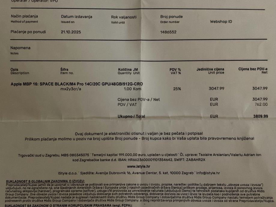 Kupljen prije 2 mjeseca u istyle za 3800€.