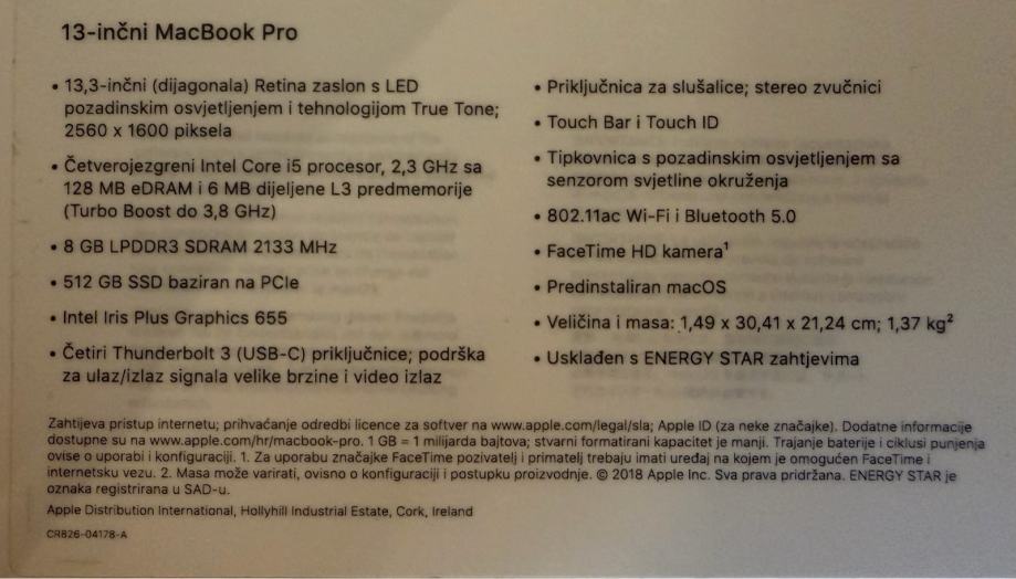 MacBook 13 - 2018 sa touch barom 512 GB
