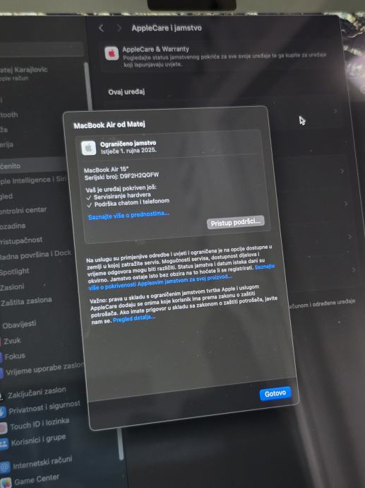 Prodajem 15-inčni MacBook Air s 16GB RAM memorije i 512GB SSD pohrane (jači model) s brzim M3 čipom. Laptop je kupljen 1.9. u Dubai Mall Apple Store-u. Ambalaža je ostala u u Dubaiju. U savršenom je stanju (10/10), vrlo malo korišten, kapacitet baterije 99%.