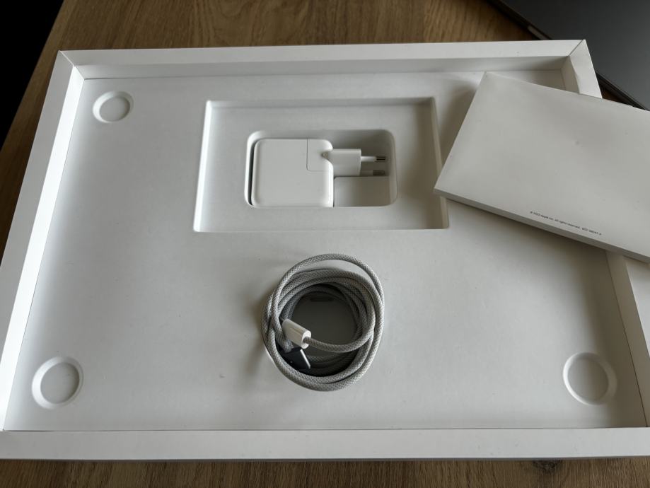 Uz laptop idu kabel MagSafe s adapterom te kutija, također uz laptop ide poklon dongle D-Link DUB-M530 5u1 sa HDMI, USB-A x2 i microSD portovima - neotvoreni.