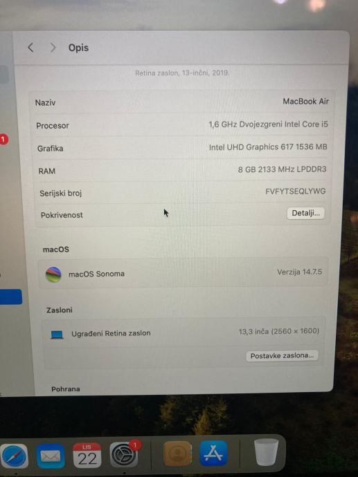 Prodajem rabljeni MacBook Air u dobrom stanju, elegantan i funkcionalan. Idealan za svakodnevni rad i multimediju, s prepoznatljivim Apple dizajnom i kvalitetnom izradom. Laptop dolazi s originalnom tipkovnicom i touchpadom, spreman za korištenje. U lipnju bio servisiran u Apple servisu u Zagrebu, instaliran novi sustav.
