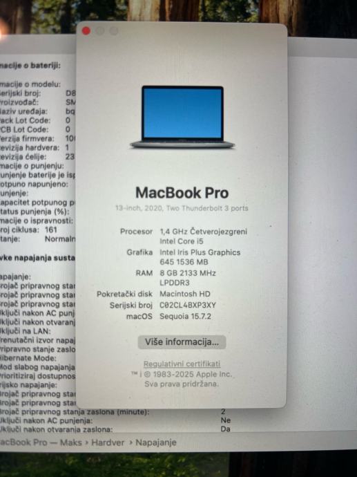 Prodajem MacBook Pro 13” (2020, Intel) – i5 1.4 GHz (4 jezgre), 8 GB RAM, 256 GB SSD, HR raspored tipkovnice, macOS Sequoia 15.7.2.