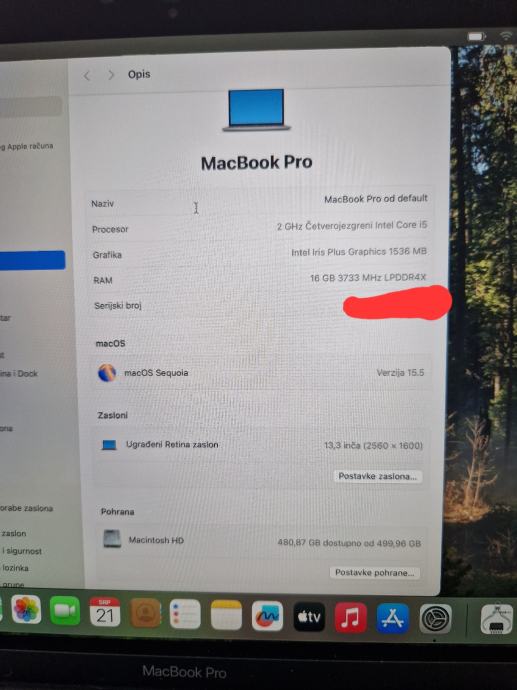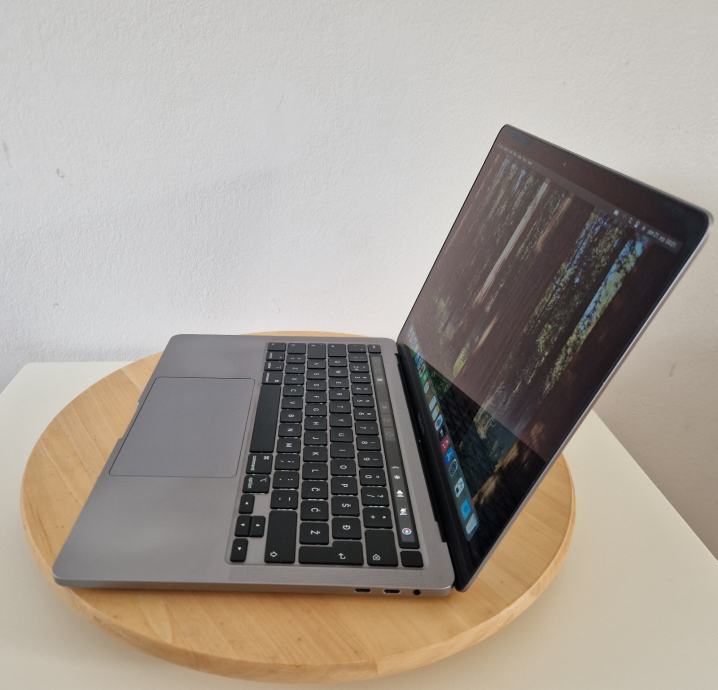 Prodajem rabljeni MacBook Pro iz 2020. godine s 13-inčnim zaslonom, procesorom i5 i 16GB RAM-a. Ima 512 GB SSD prostor za pohranu i Intel Iris Plus Graphics 1536 MB grafičku karticu. Zdravlje baterije normalno.