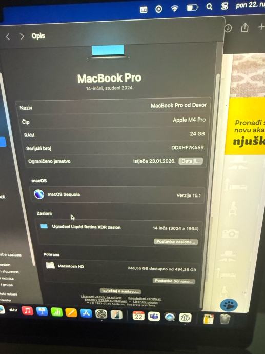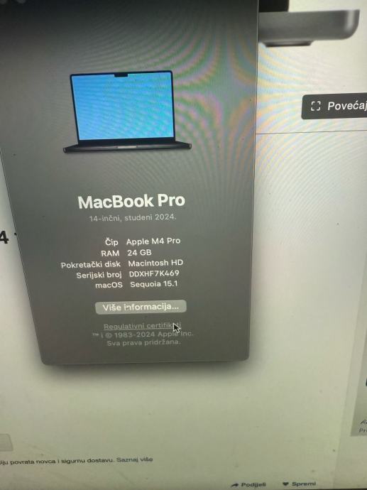 Prodajem Apple MacBook Pro 14″ (M4 čip, 24 GB RAM, 512 GB SSD) kupljen 11/2024. 99% baterija.
