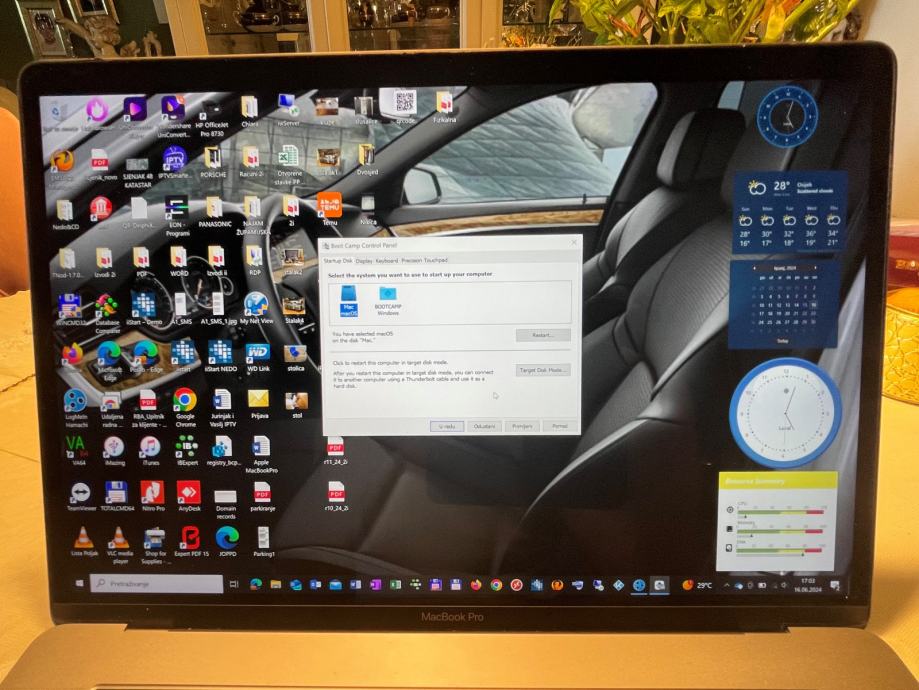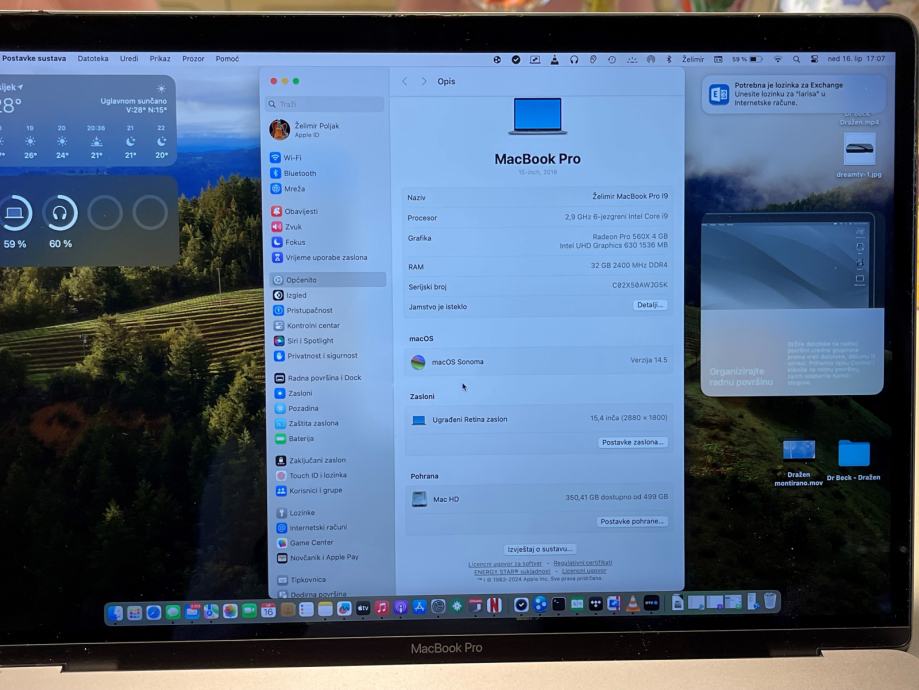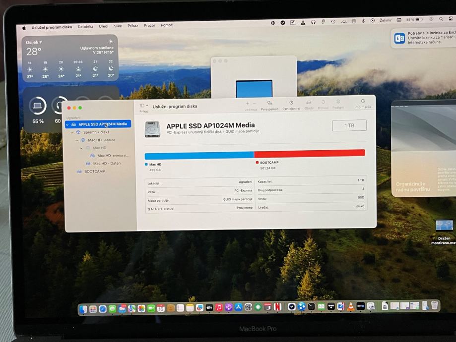 Radeon Pro 560X 4GB. Disk je podijeljen na dva od 500 GB. Na jednom je instaliran MACOS Sequoia 15, a na drugom Windows 10.