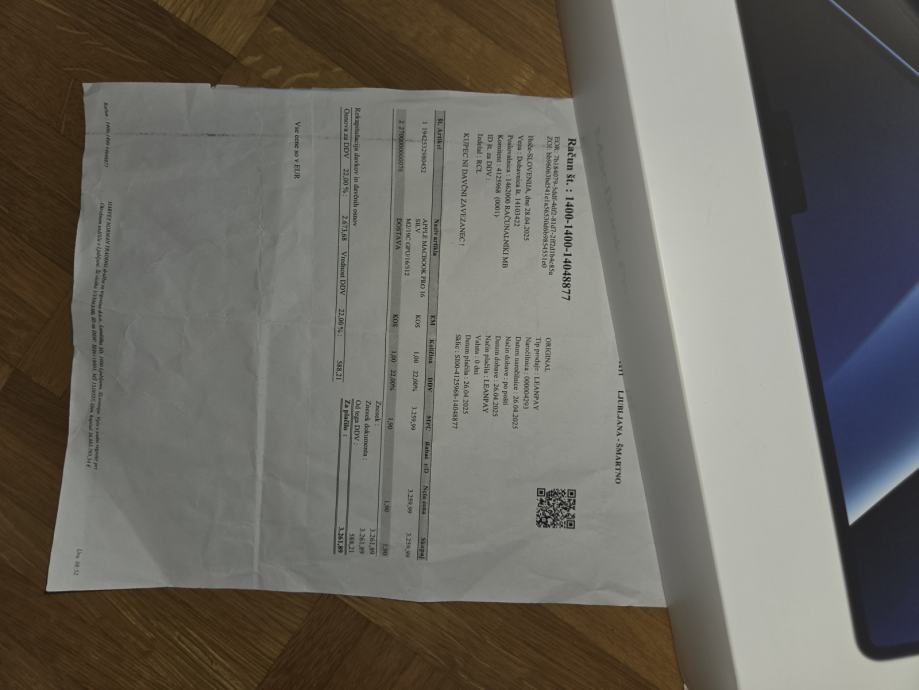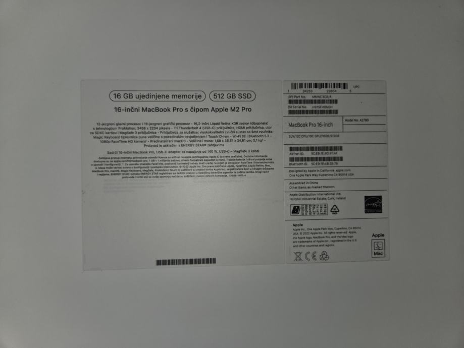 Zaslon Liquid Retina XDR zaslon 41,15 cm (16,2"); 3456 × 2234 254 ppi, 1000 nit (do največ 1600), 1 milijarda barv, Wide color (P3), True Tone tehnologija