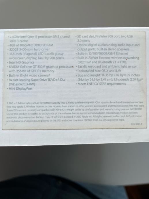 Prodajem MacBook Pro A1286 za dijelove. Riječ je o 15-inčnom modelu s Intel Core i5 procesorom (2.4GHz, 3MB shared level 3 cache), 4GB RAM-a (1066MHz DDR3 SDRAM), 320GB tvrdog diska (5400 rpm) te NVIDIA GeForce GT 330M grafičkom karticom s 256MB memorije. Ekran je 15.4-inčni LED-backlit glossy widescreen, rezolucije 1440 x 900 piksela.
