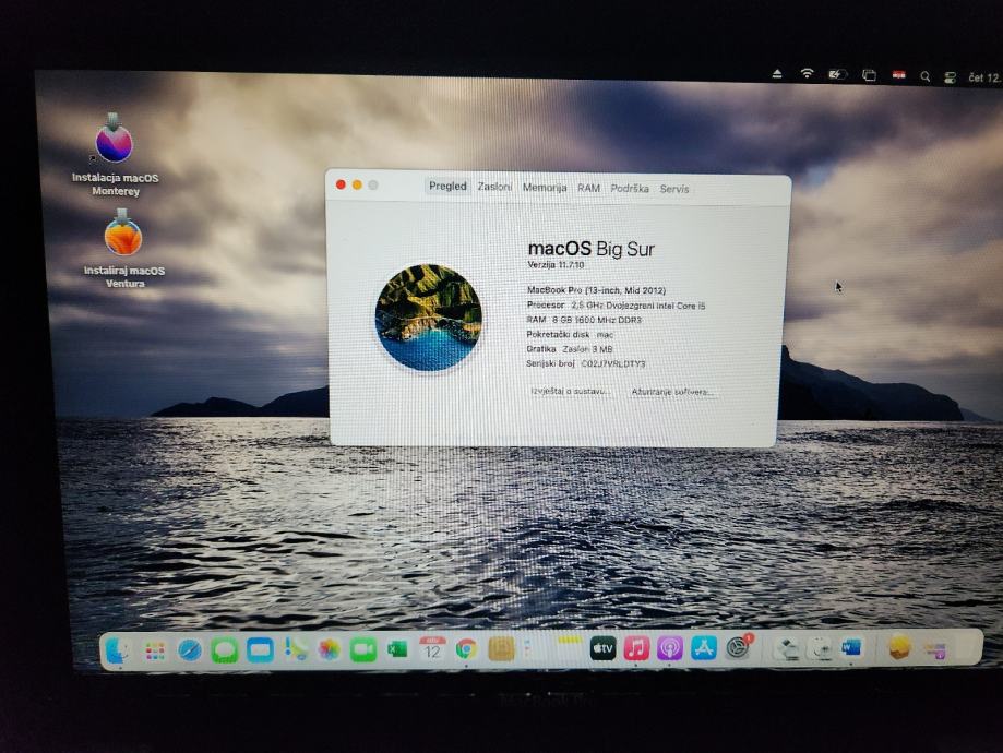 Prodajem rabljeni Apple MacBook Pro laptop. Uređaj je funkcionalan i pokreće macOS Big Sur. Tipkovnica i trackpad su u ispravnom stanju, a baterija traje do 2 sata!Prodaje se sa punjacem!